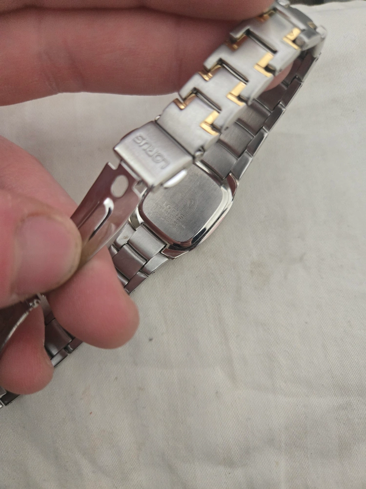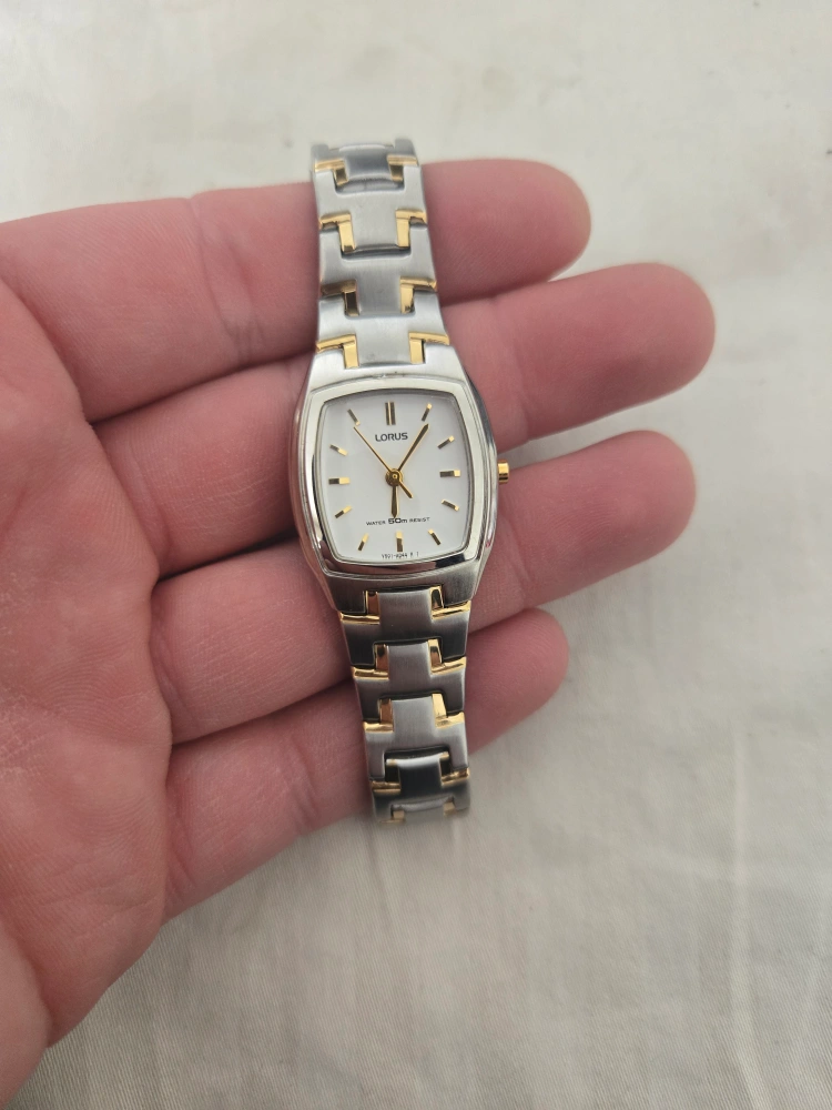 Pre-owned Lotus women's watch. Features a white face, two-tone metal band, and water-resistant design. Square-shaped watch case.