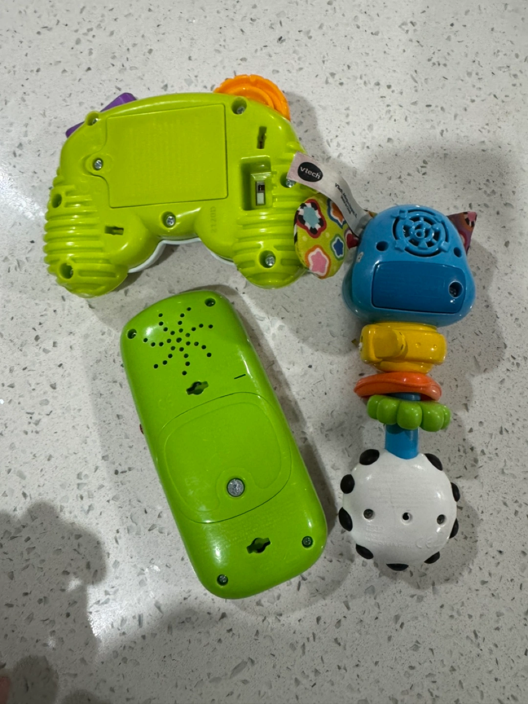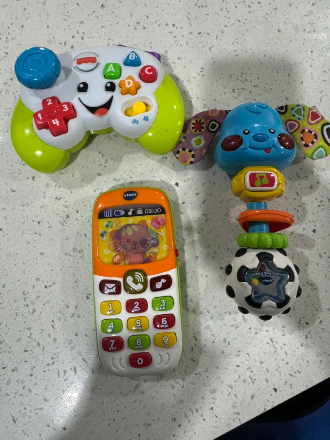 Pre-loved VTech baby toys. Includes a controller, a phone, and a rattle. Great for babies and toddlers. Fun colours and sounds.