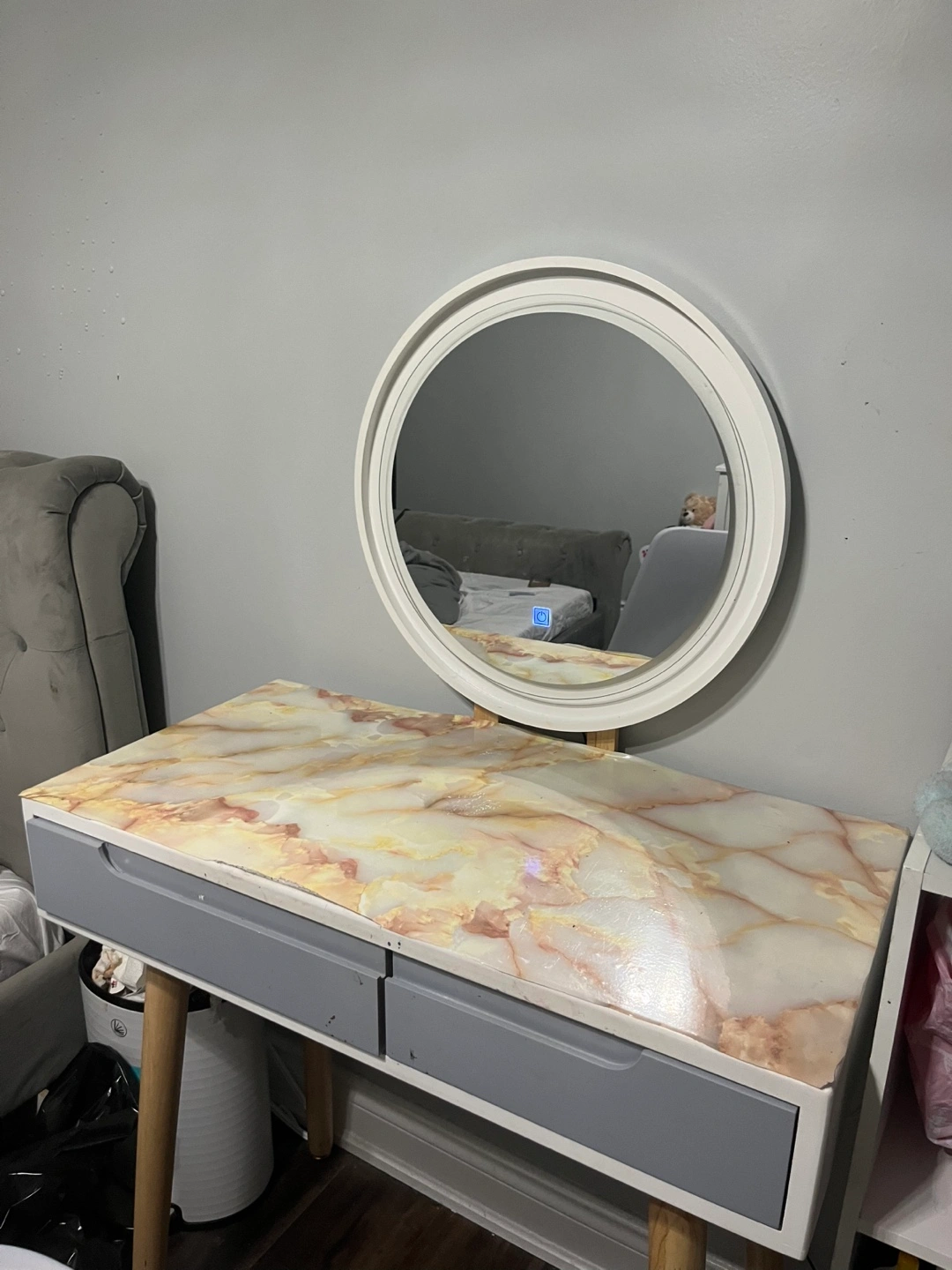 White vanity set with marble-look top. Two drawers. Round mirror. Includes a white plastic chair with wooden legs. Minimalist style.