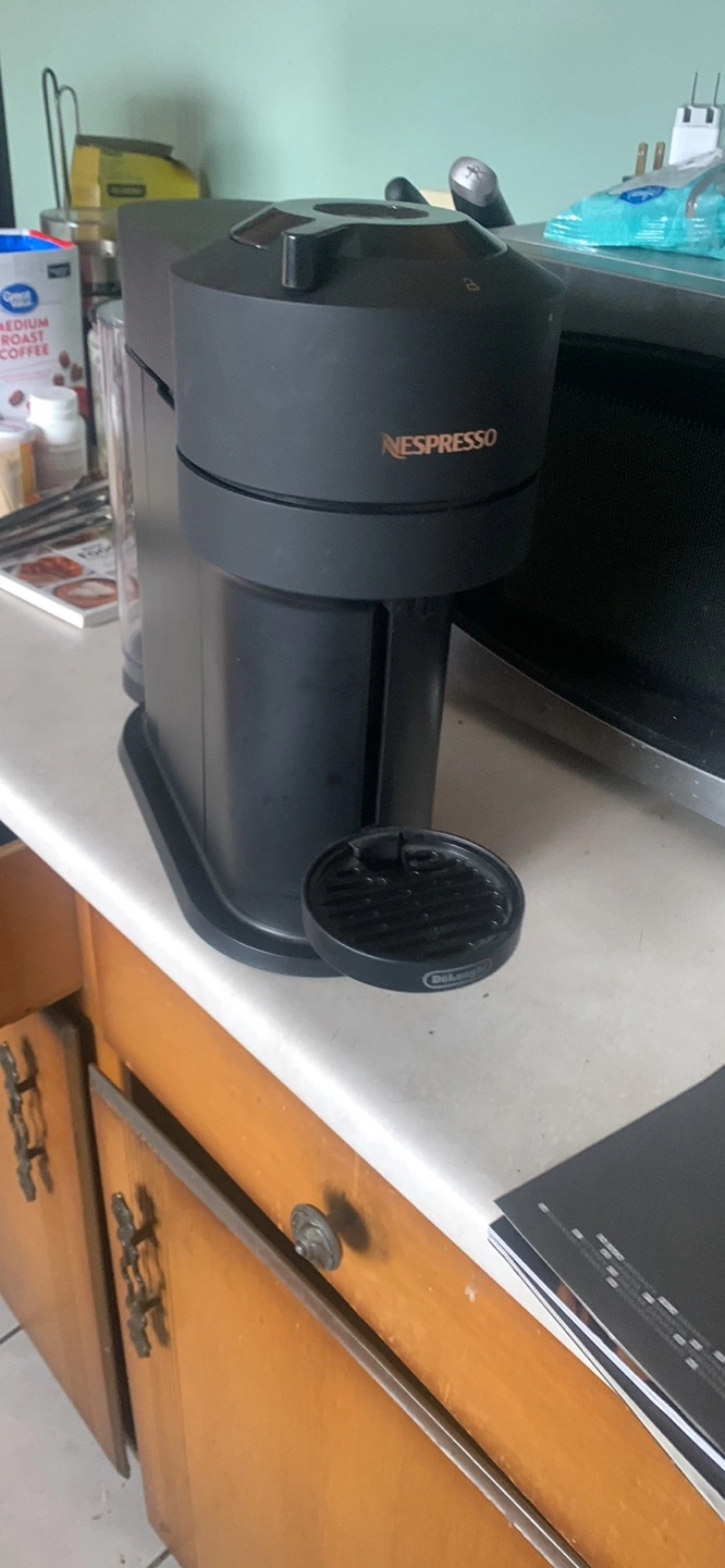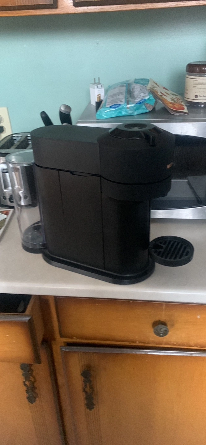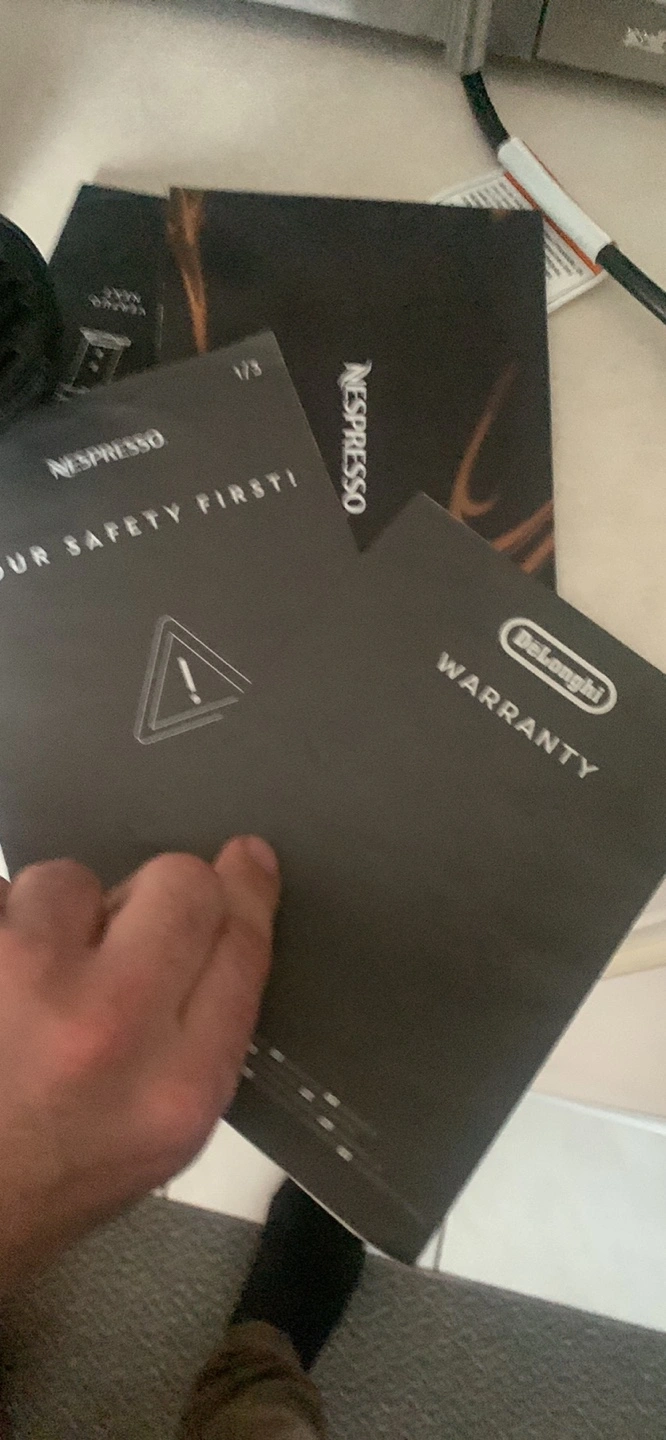 Compact coffee machine. Makes espresso. Includes instruction manual and warranty information. Black colour.