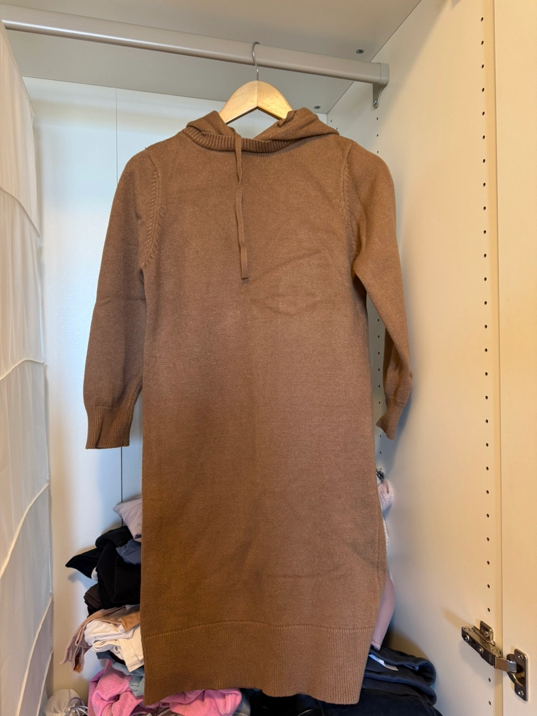 Cozy brown hooded sweater dress. Long sleeves, midi length. Perfect for fall or winter. Soft knit material. Fit for petite lady. Or kids size 12-16