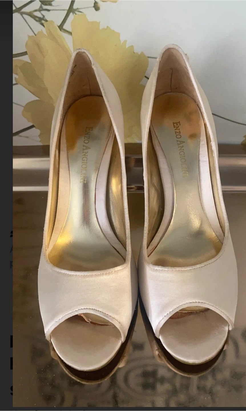 Elegant Enzo Angiolini peep-toe heels in a classic white hue. These stylish shoes feature a comfortable fit with a chic stiletto heel. They're perfect for special occasions or elevating any outfit!