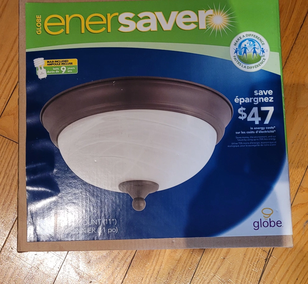 11-inch flush mount ceiling light. Brown finish, white glass shade. Energy efficient. Bulb included. Easy installation.