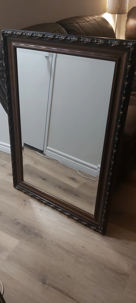 Large mirror, dark brown wooden frame. Intricate detailing. Great for hallways or bedrooms.