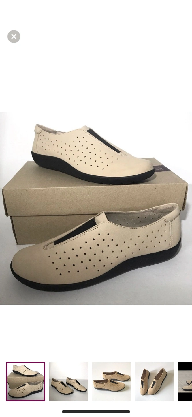 Lightly cushioned slip-on shoes. Beige leather upper with perforated detailing. Black fabric accent. Rubber sole. New in box.
