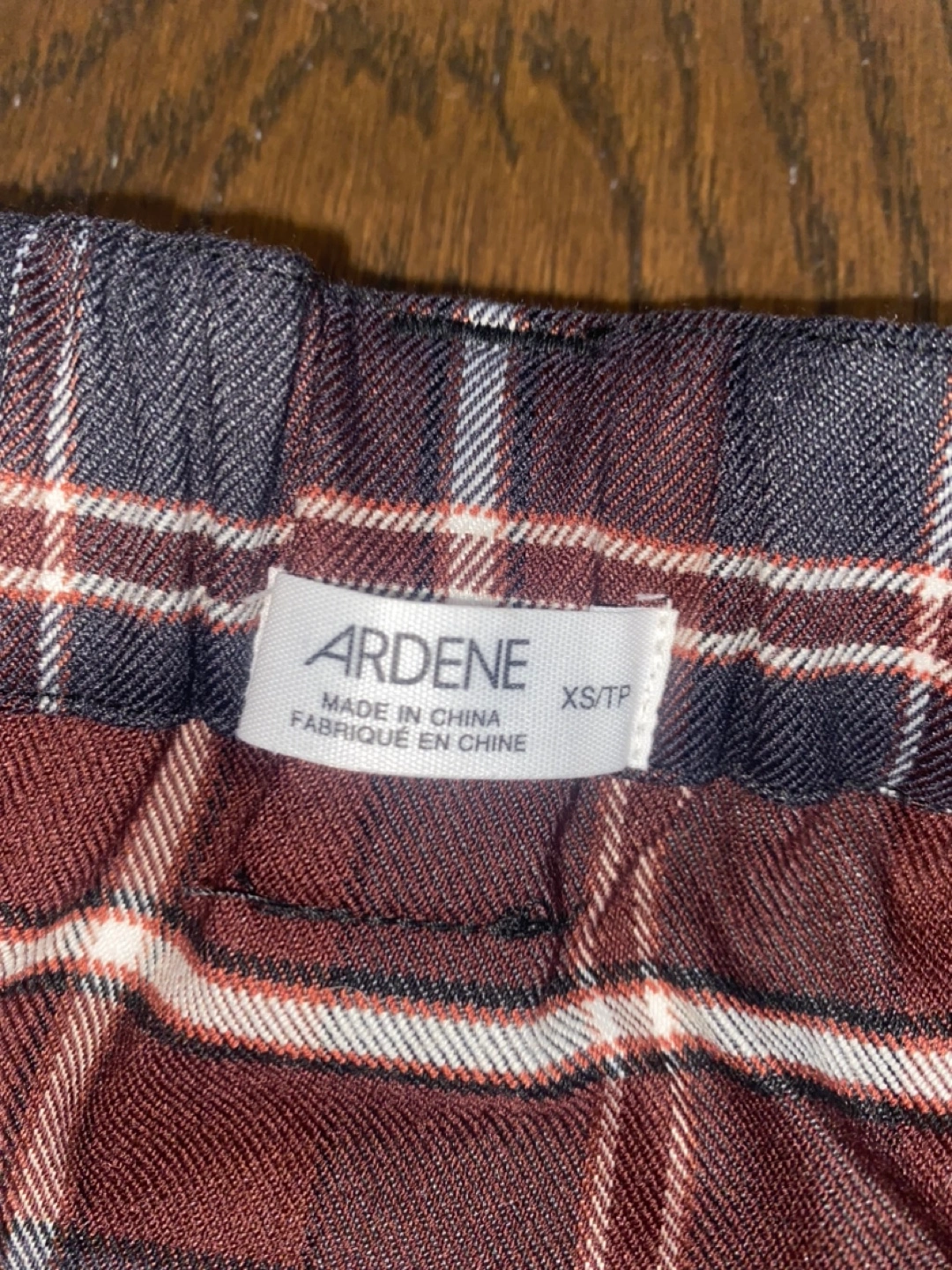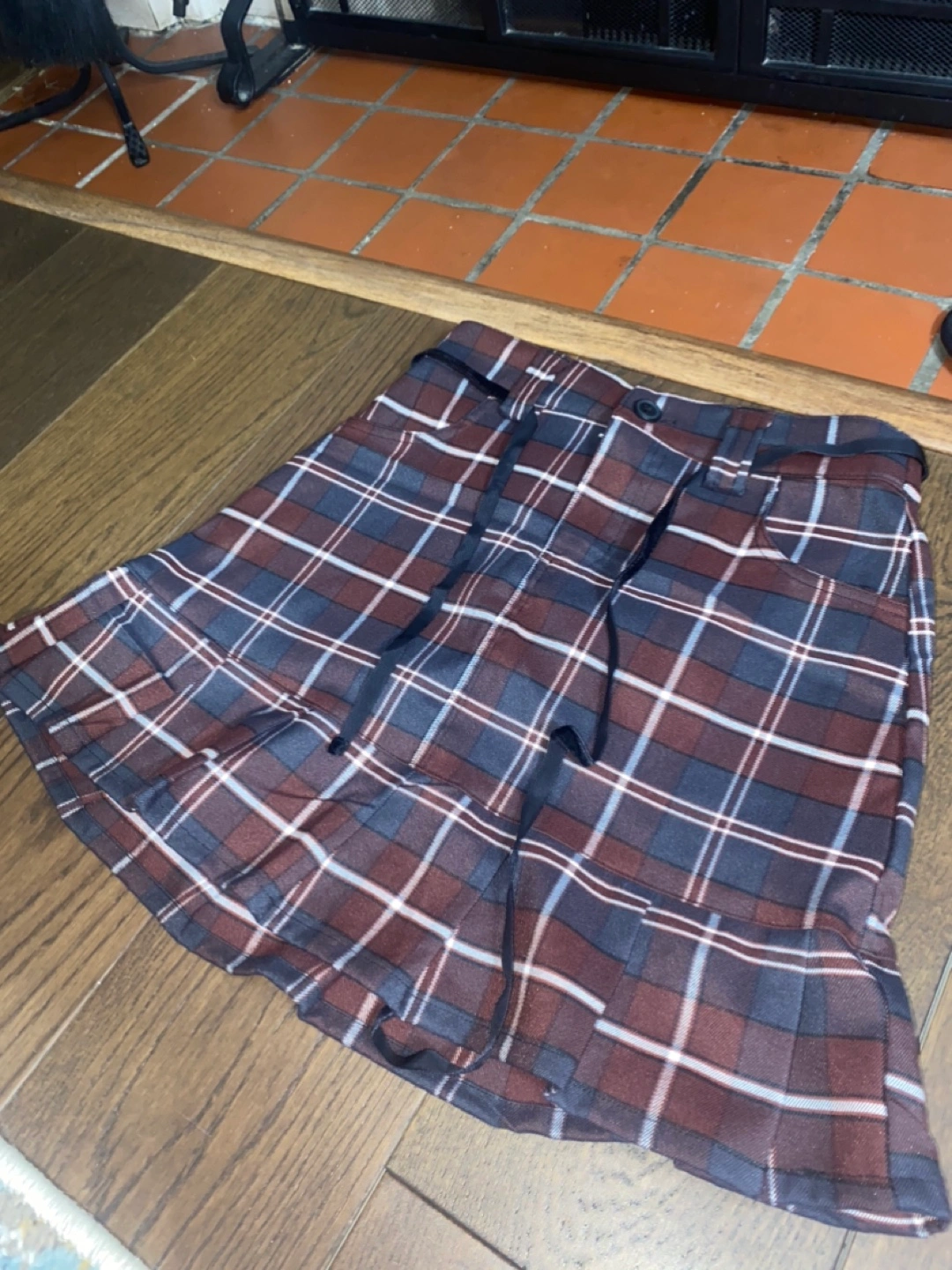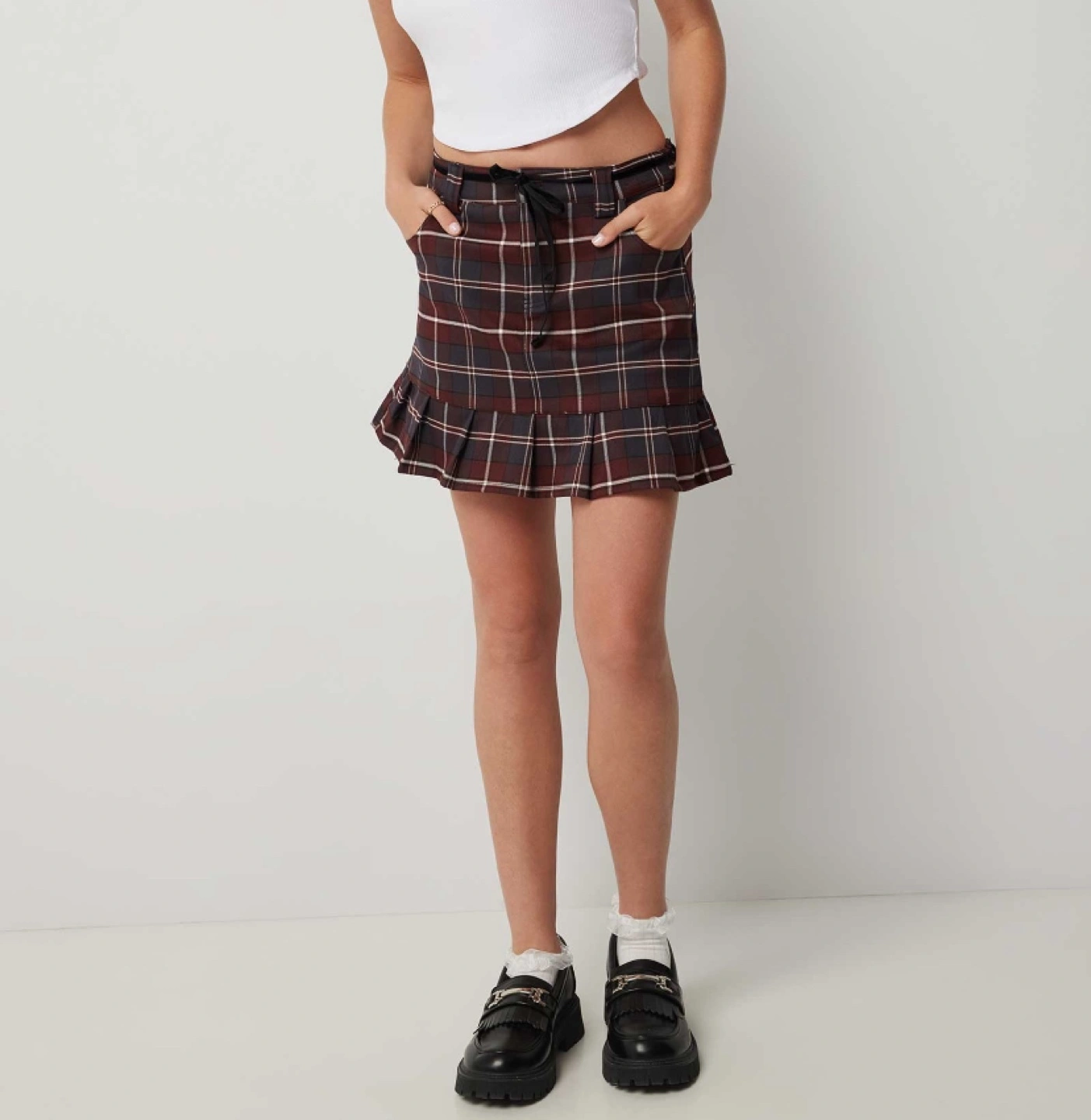 Mini pleated skirt. Button and fly closure Tie belt, stretchy on the back. Plaid print 80% polyester, 18% rayon, 2% spandex I’m usually a size XXS or XS and this felt too loose. it supposed be a bit mid rise low waisted. Fits more of a size small. no shorts inside, has pockets. only worn it once. Has ruffles the bottom the skirt. Ardene model wearing the skirt.