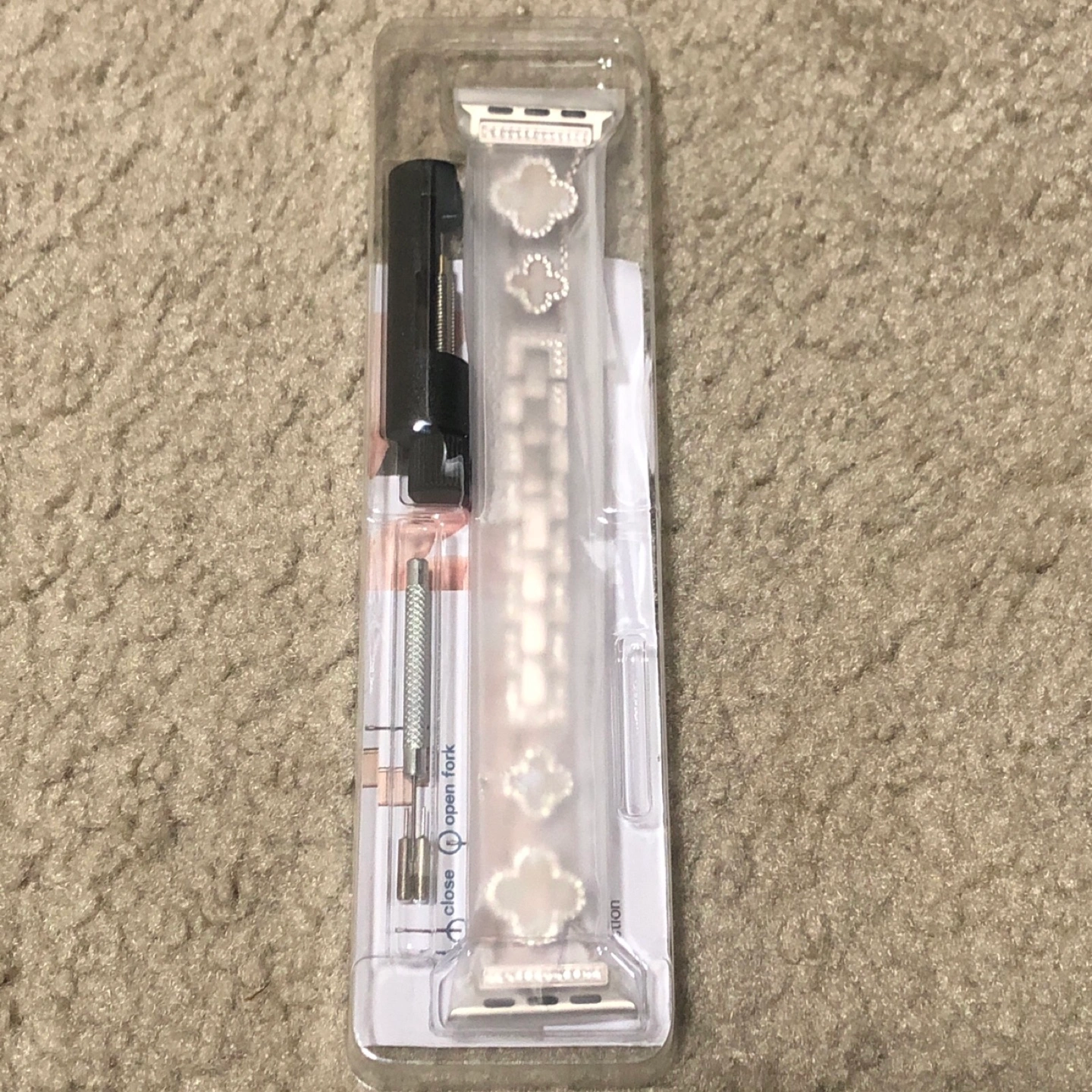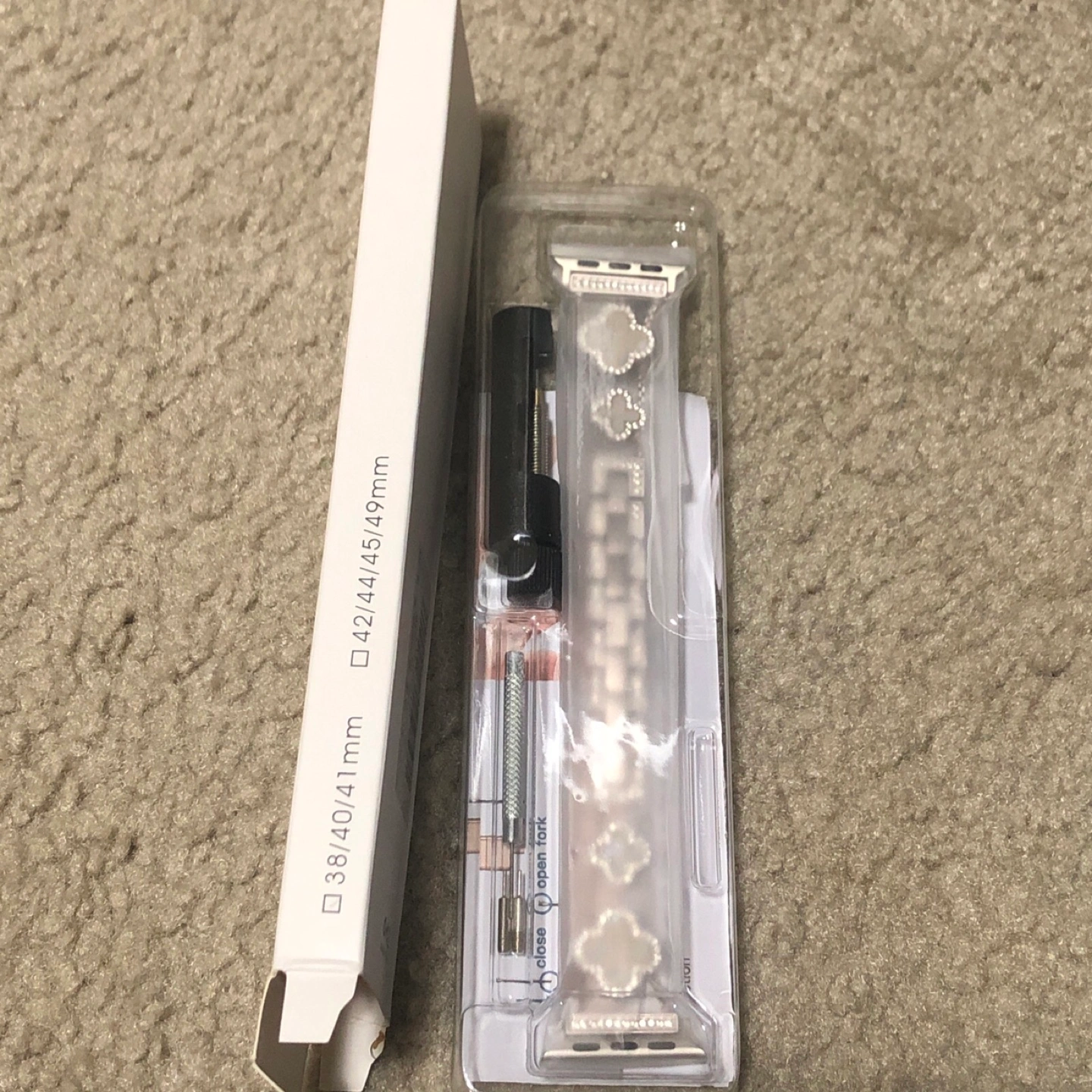 Brand new Watch band. Rose gold color with clover accents. Includes easy-to-use installation tool. Fits 38/40/41/44/45/49mm Apple Watches. Stylish and elegant.