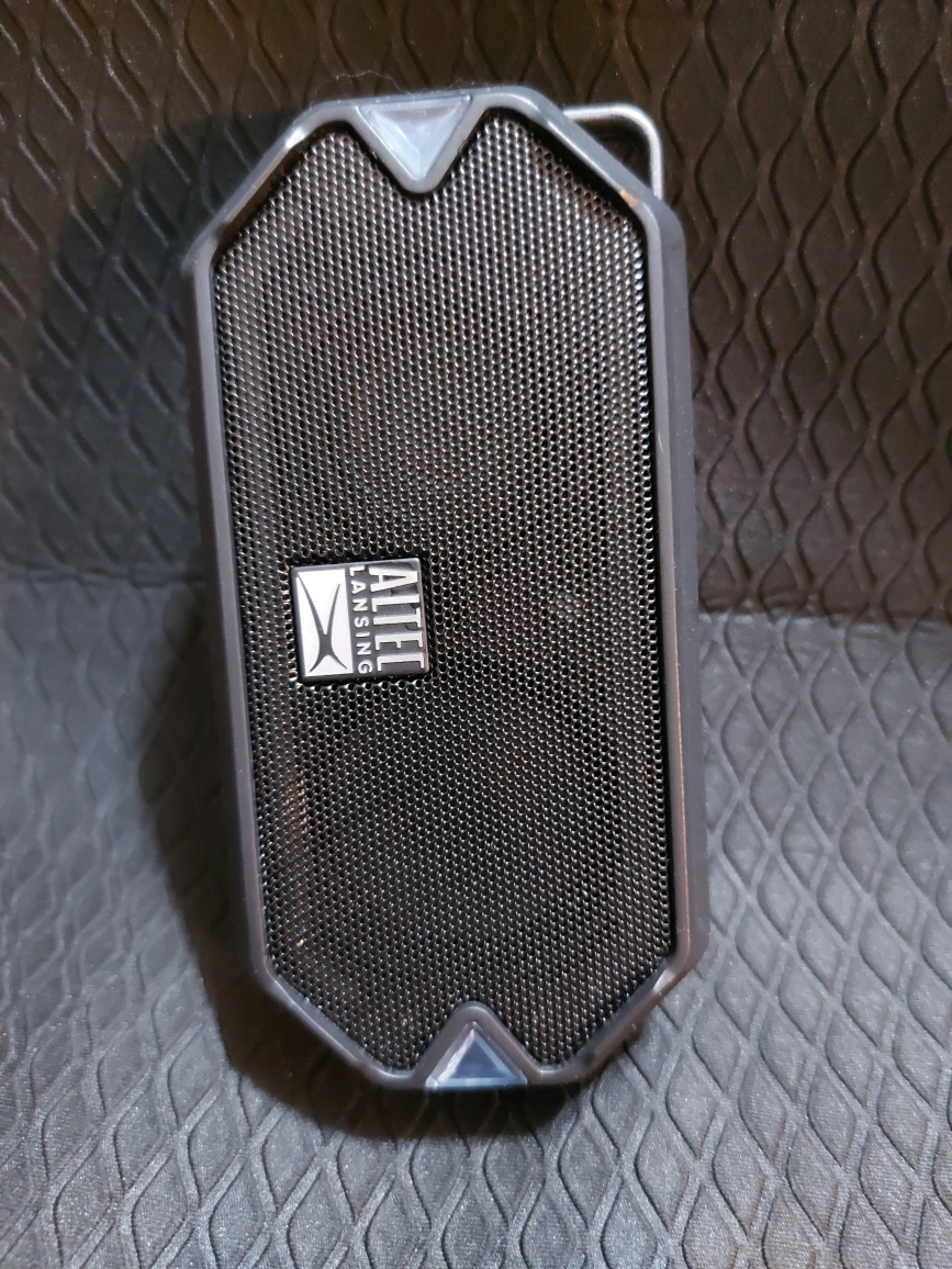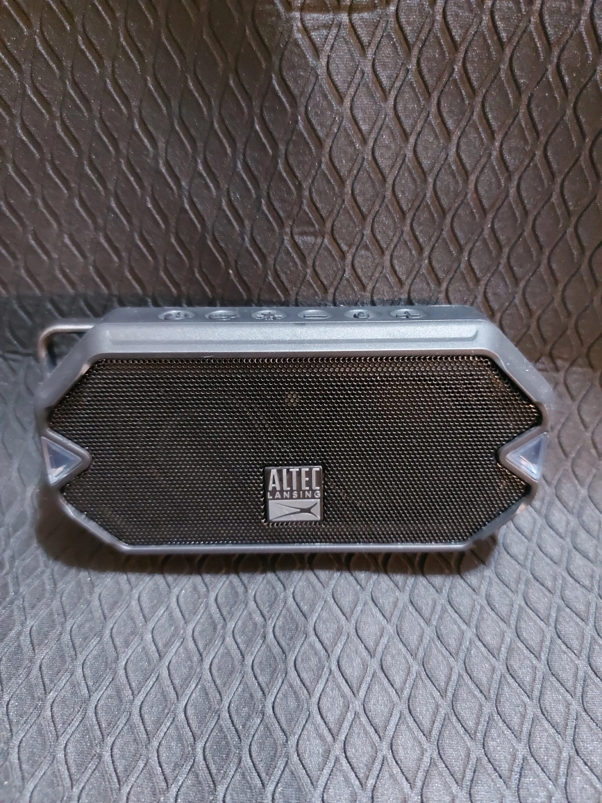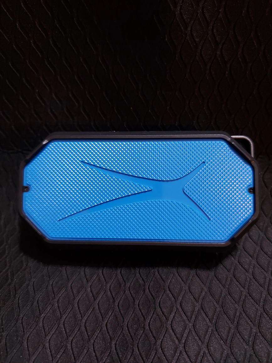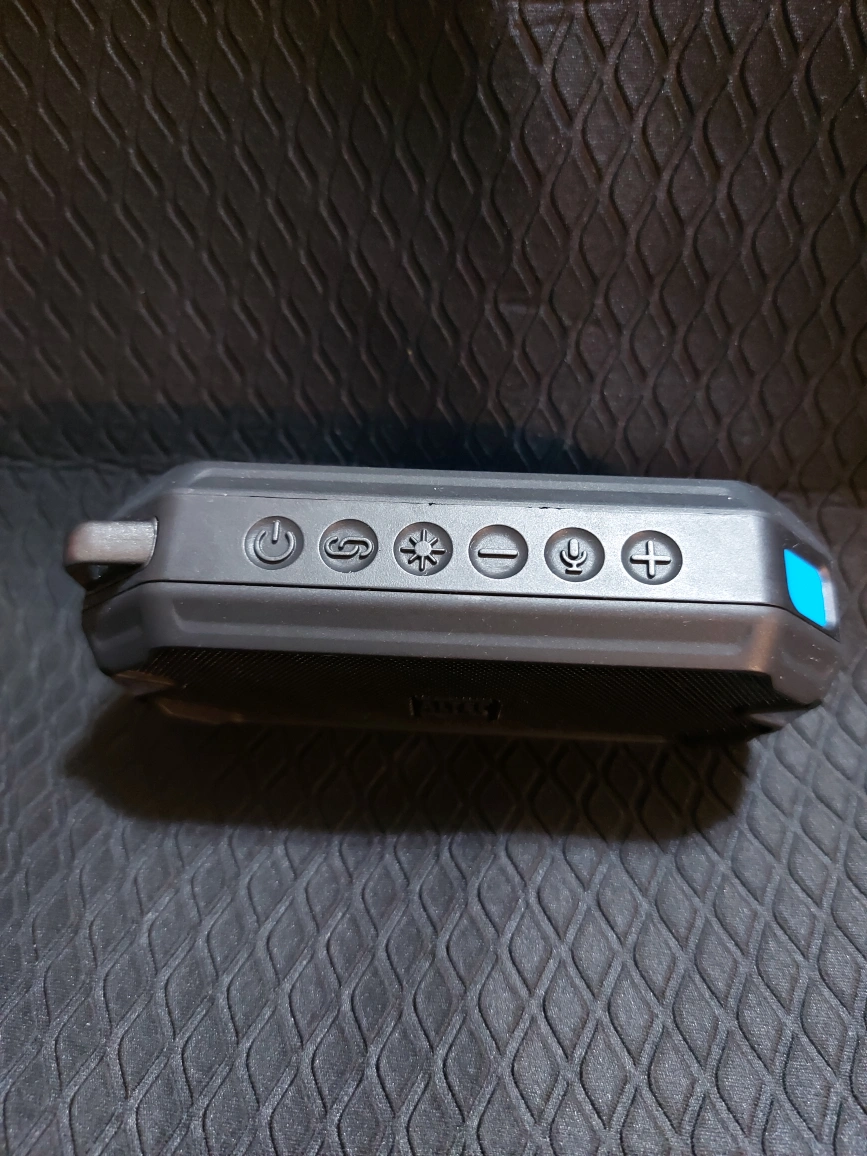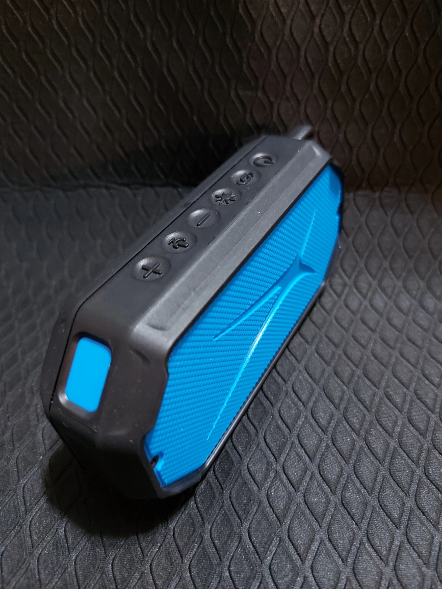 10Durable, compact Bluetooth speaker. Features multiple buttons for volume, power, and other functions. Black and blue design. Portable and easy to carry.