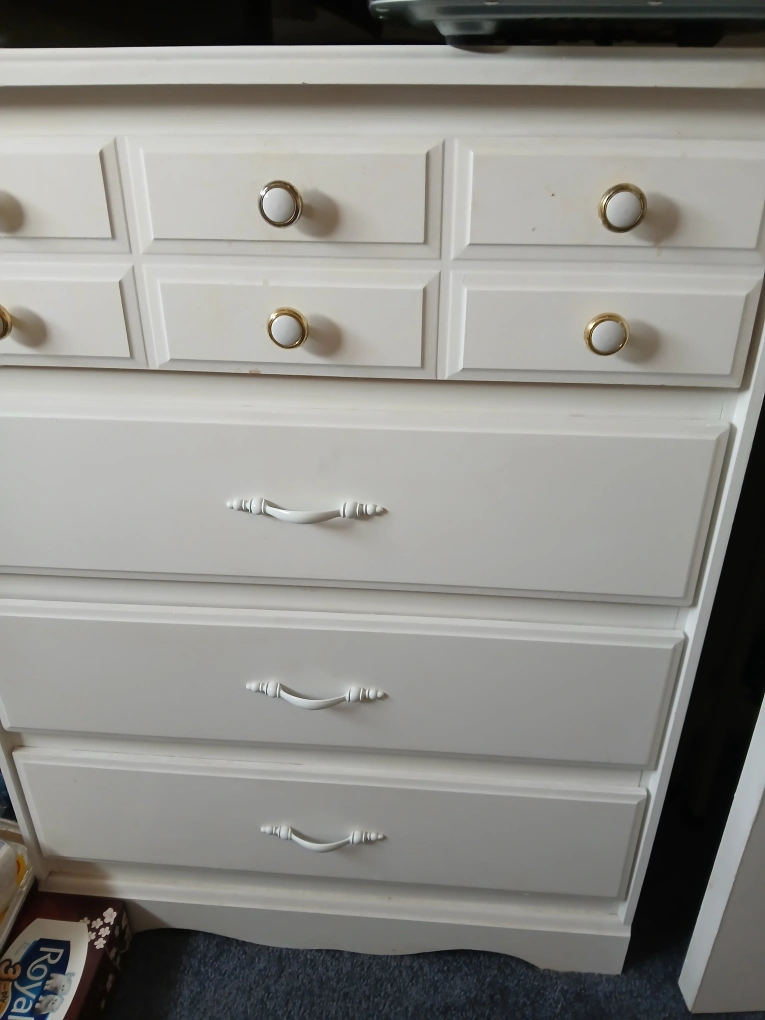 Off-white chest of drawers. Six small drawers at the top and three larger drawers at the bottom. Features white knobs and curved handles. Some minor wear. Also have twin size bed for sale