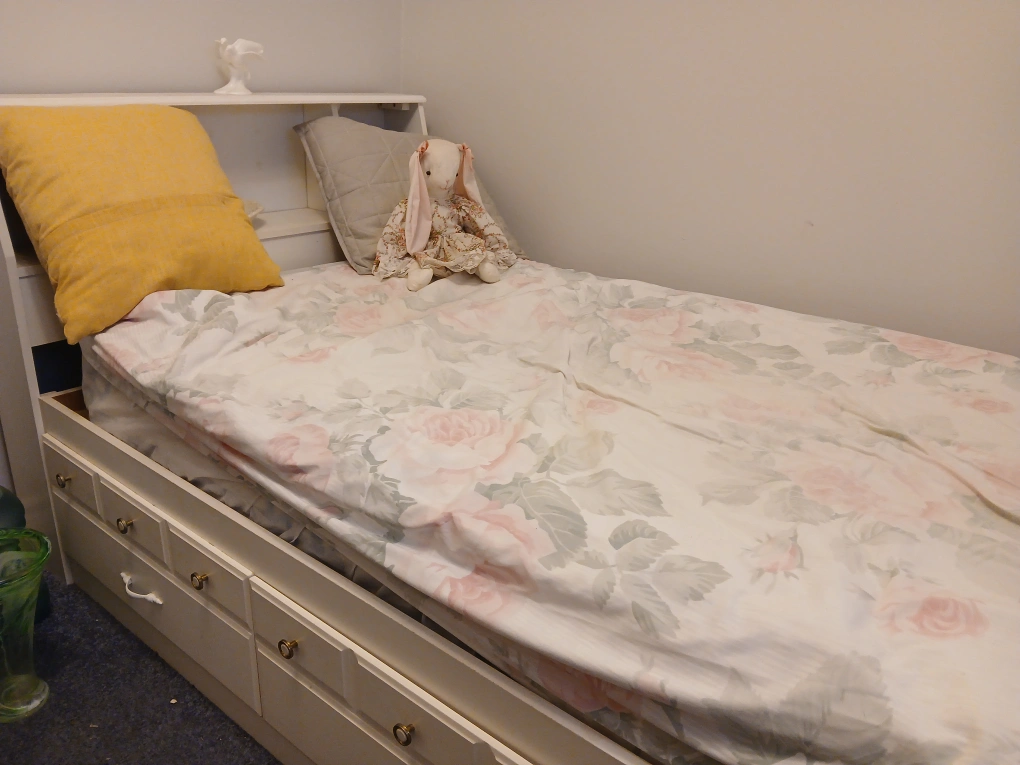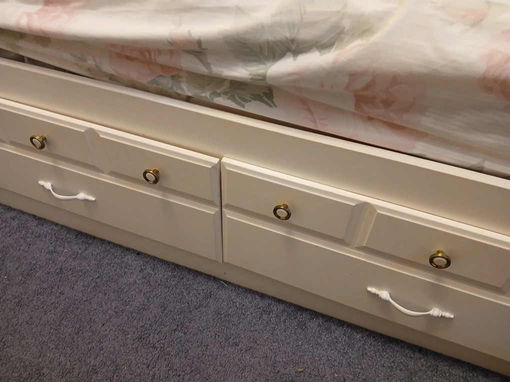Twin-size bed frame, off-white finish. Built-in headboard with three open shelves. Four drawers provide extra storage. Good used condition. Also have matching dresser.