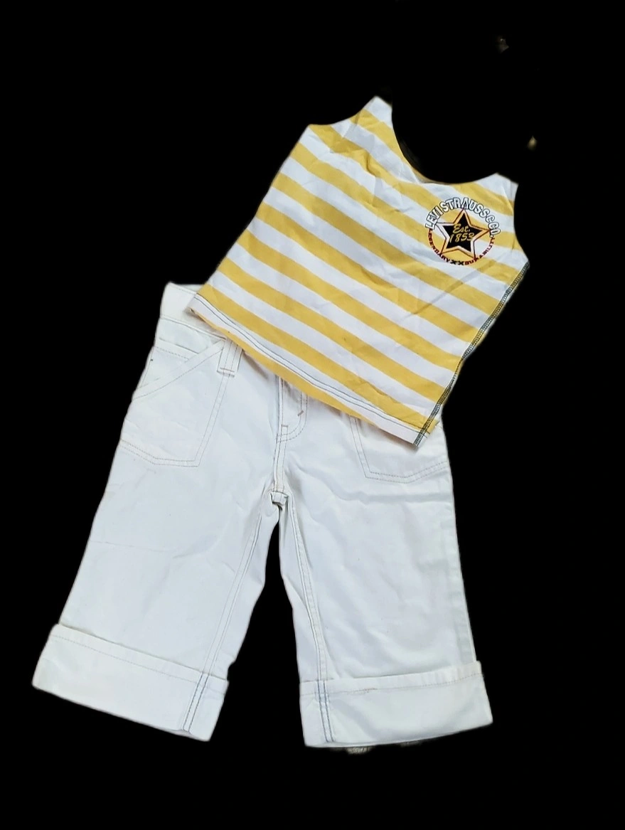 Adorable girls' summer outfit. Includes a yellow and white striped halter top with a graphic design and cute off white denim shorts.