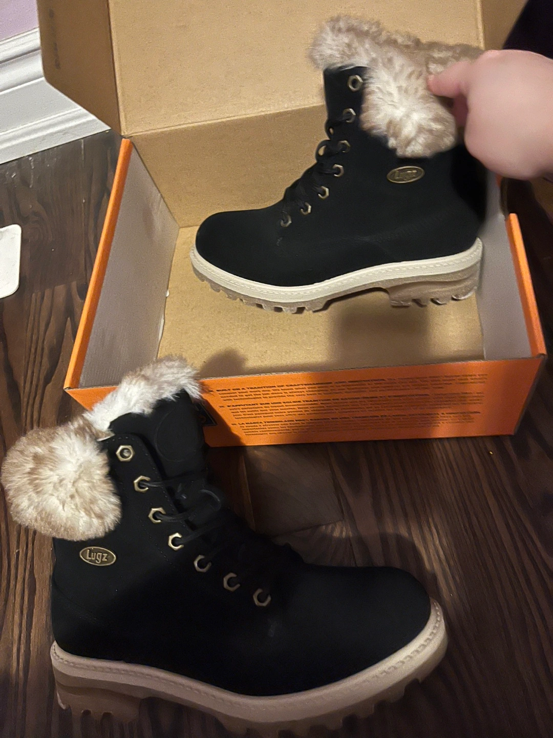78Pair of black winter boots. Faux fur trim. Lace-up closure. Cream-coloured sole. New in box.