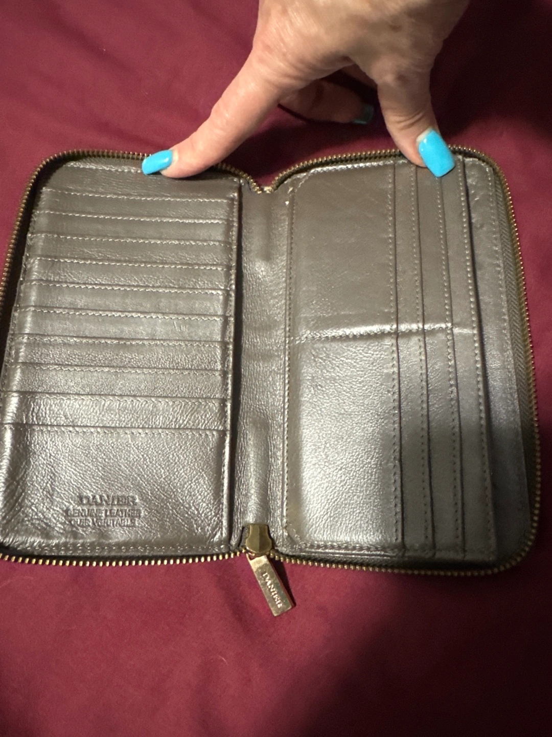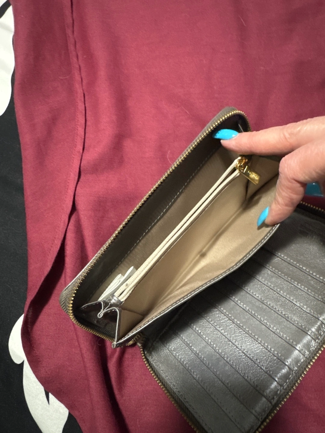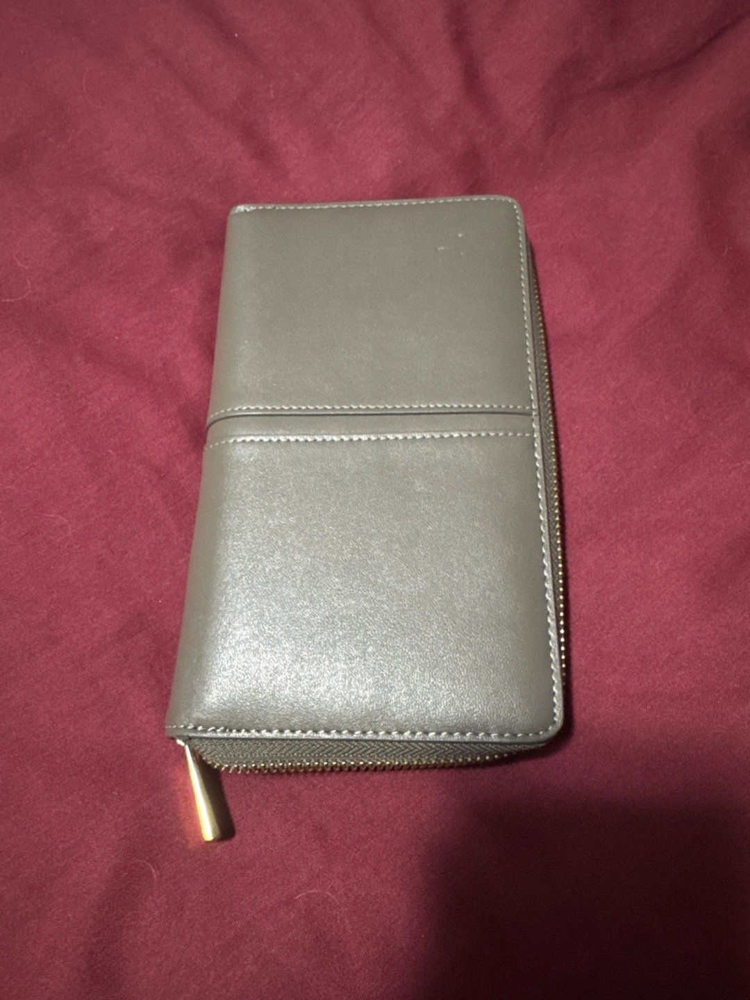 Taupe leather zip-around wallet. Multiple card slots and compartments. Gold-toned zipper. Excellent condition.