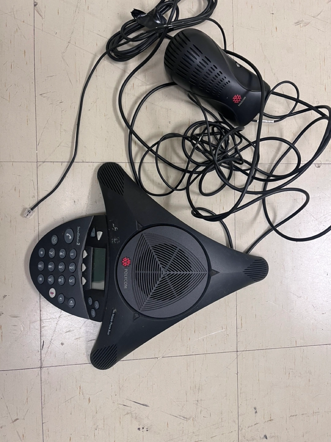 Polycom SoundStation2 conference phone. Includes expansion microphone. Good condition. Includes power cord and cables. Triangular base. Multiple buttons and a display screen.