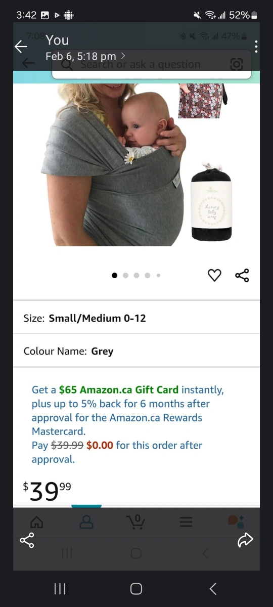 Grey baby wrap. Size small/medium for 0-12 months. Soft fabric. Suitable for newborns and infants. used just handful of times, no stains - smoke free, pet free home. Retails for $40 + tax