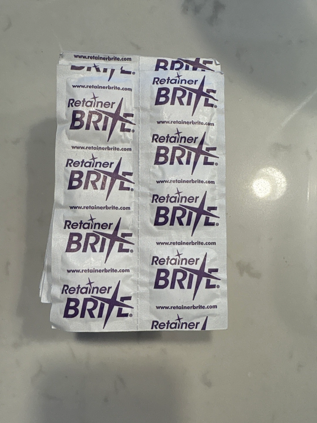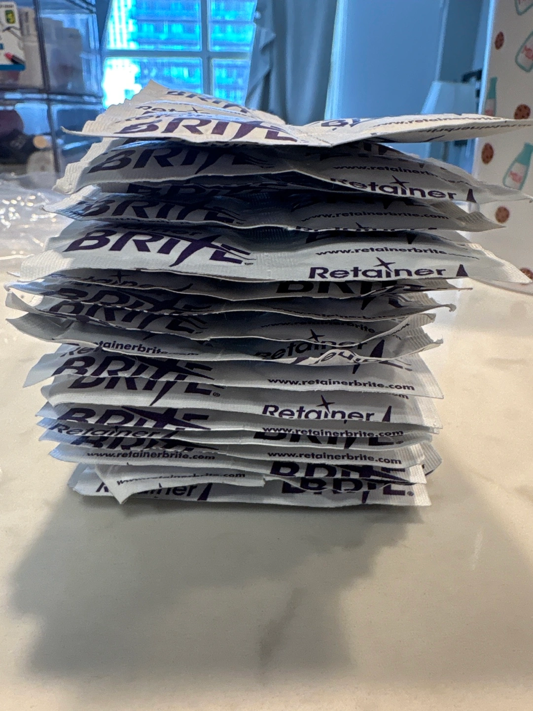 About 19 packs of Retainer Brite cleaning tablets. Great for cleaning retainers. Bulk purchase, ideal for frequent use.