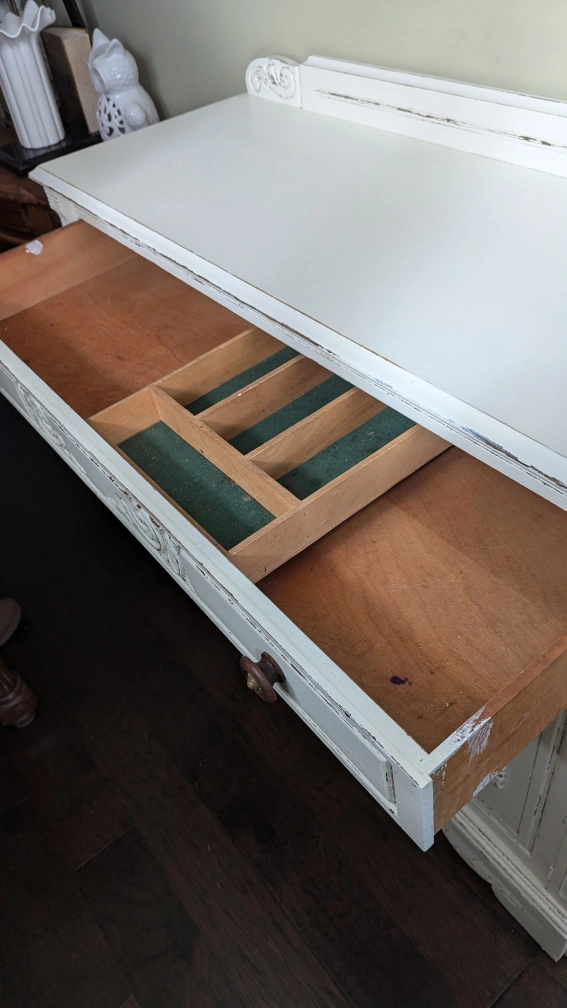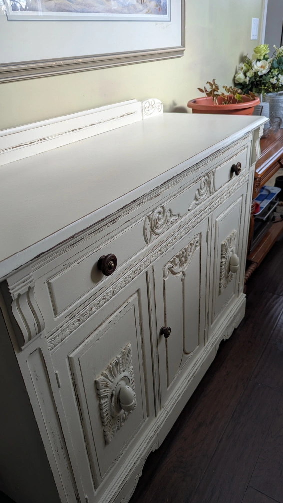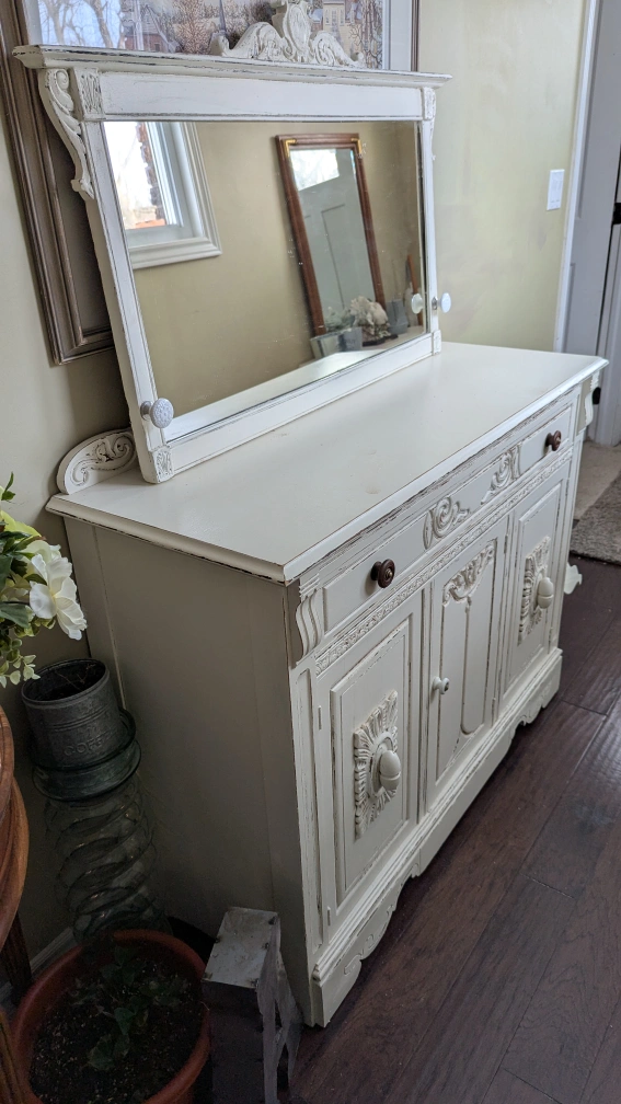 Ornate buffet server with matching mirror...Built by the National Table Co. Owen Sound Ont..Features distressed white paint. Includes three doors and one drawer, with a cutlery tray. Intricate carvings and detailing. Beautiful addition to any home.Open to offers..