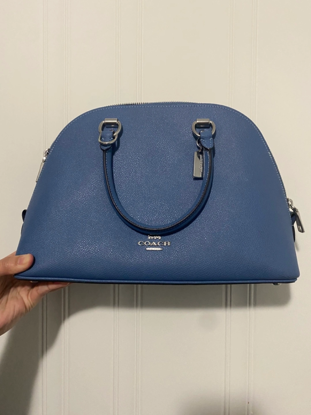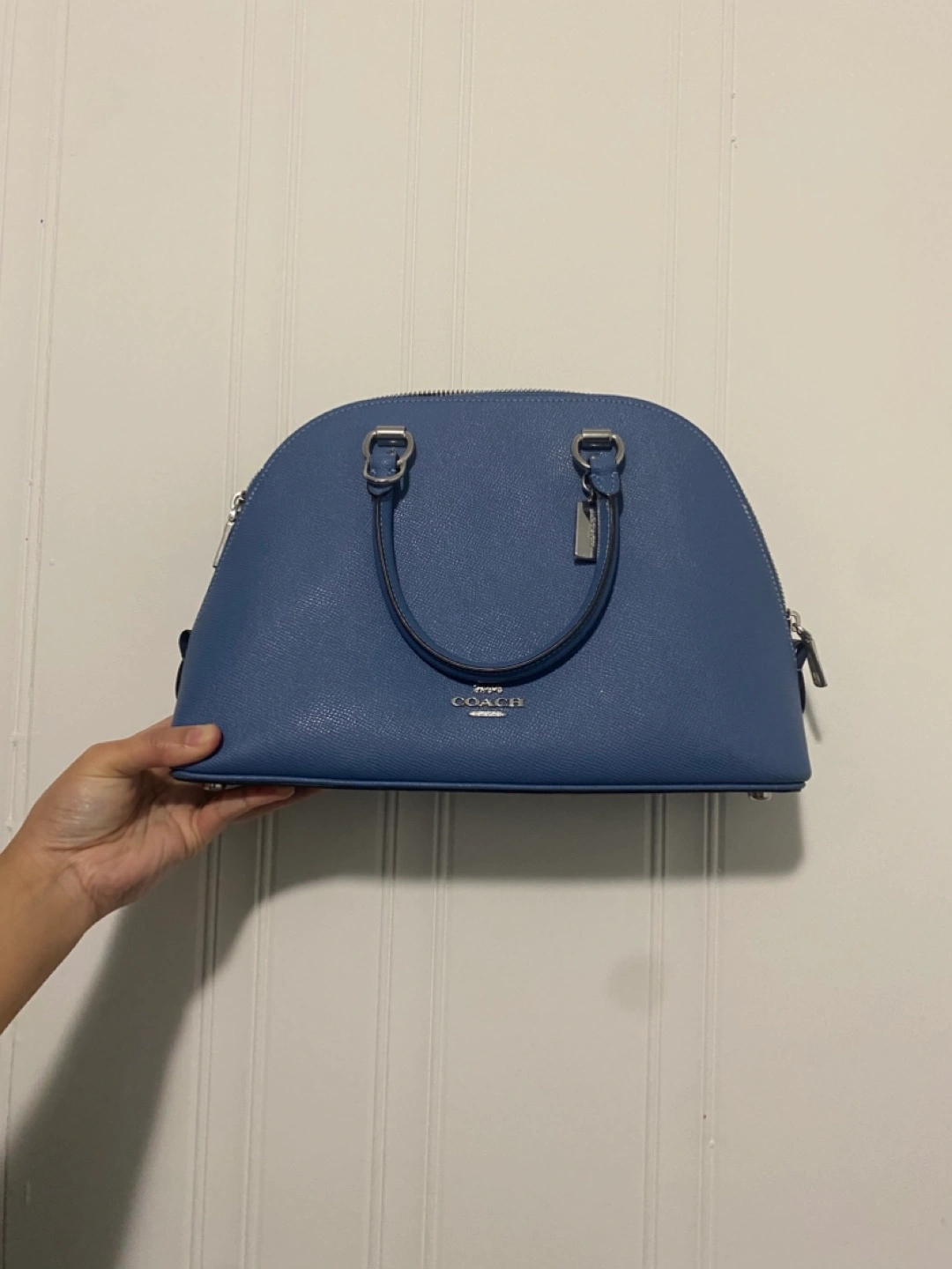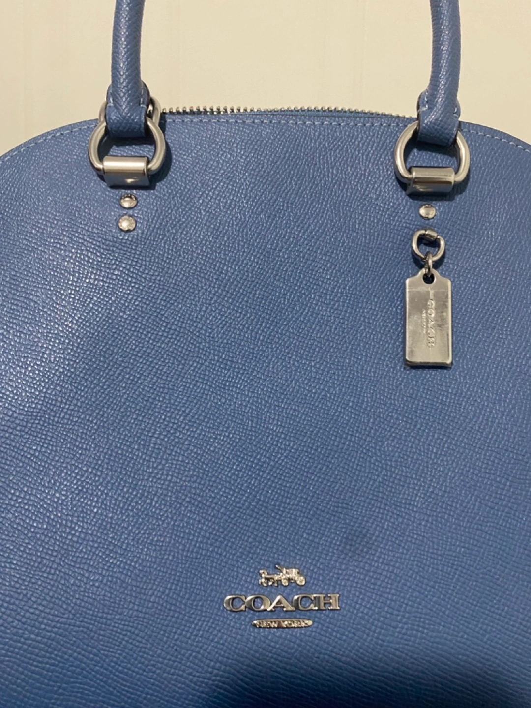 10Beautiful blue Coach satchel. Features a dome shape, top handles, and a detachable strap. Silver-toned hardware. Zip closure. Cash only