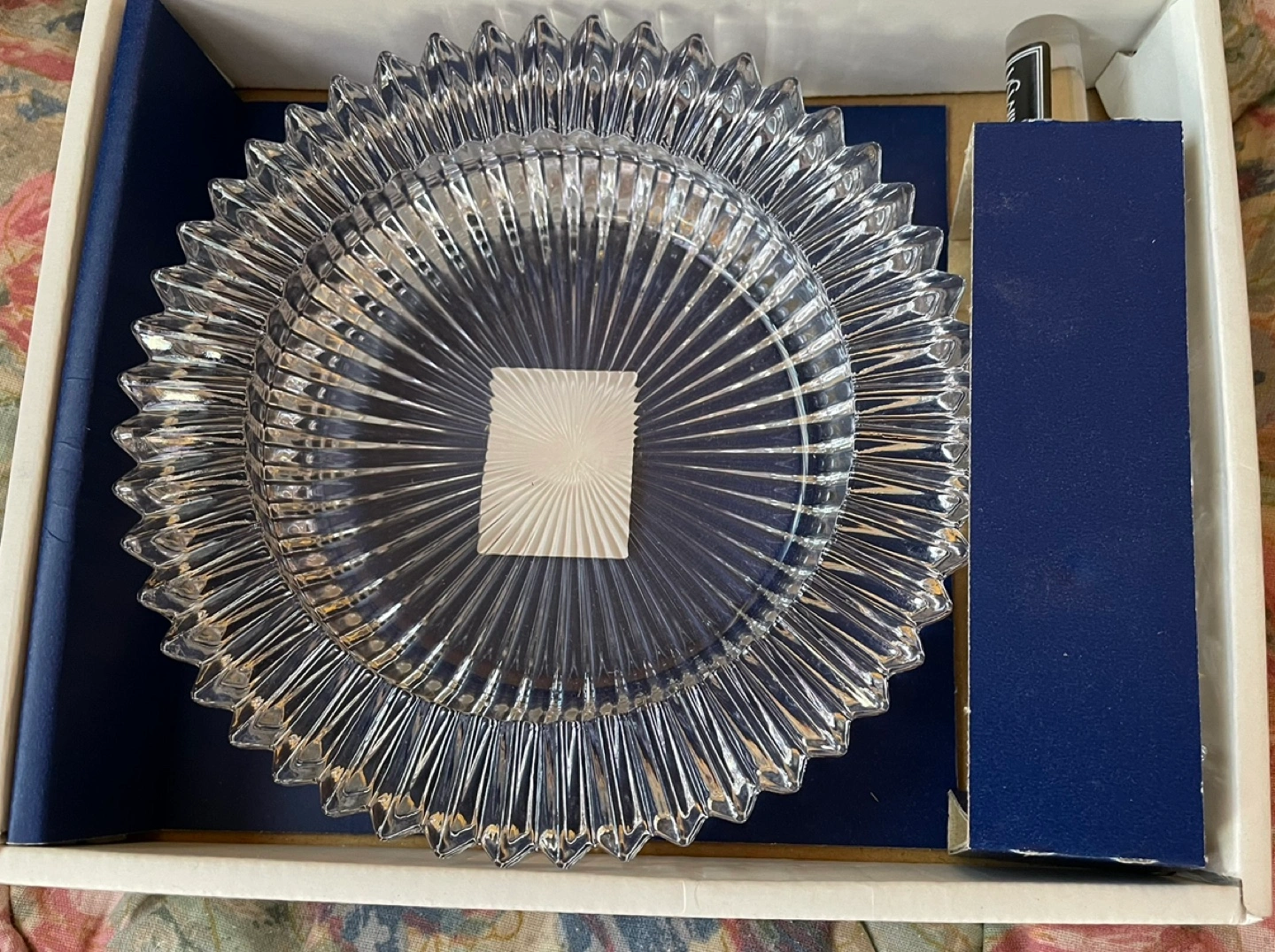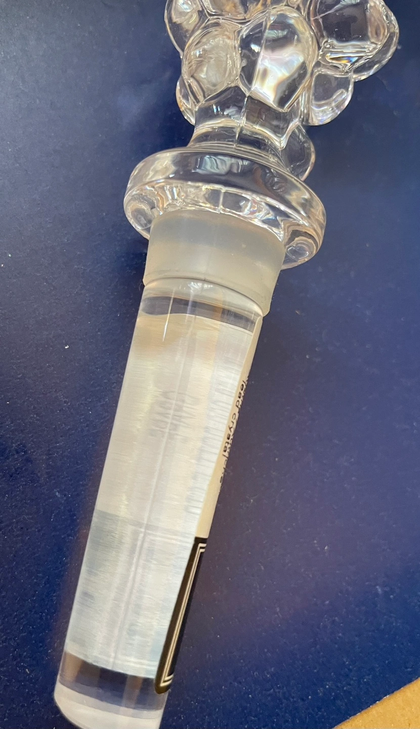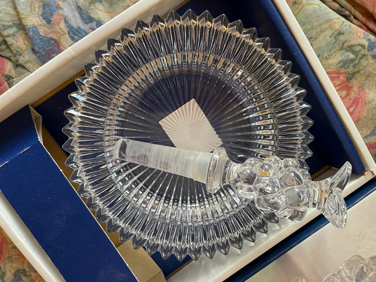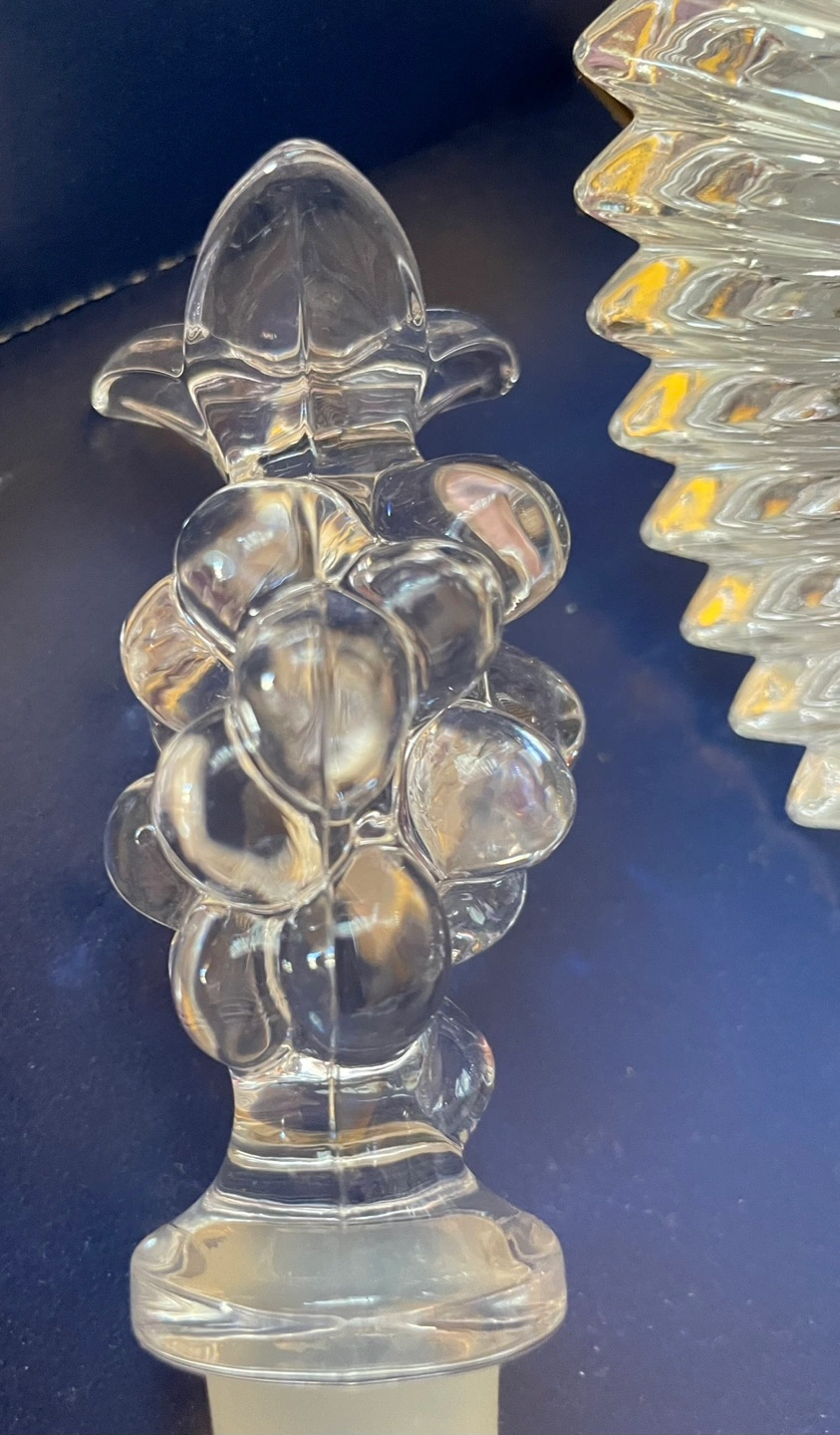 Elegant crystal wine bottle stopper and matching coaster. Grape motif stopper. Coaster features a unique, faceted design. In original box.