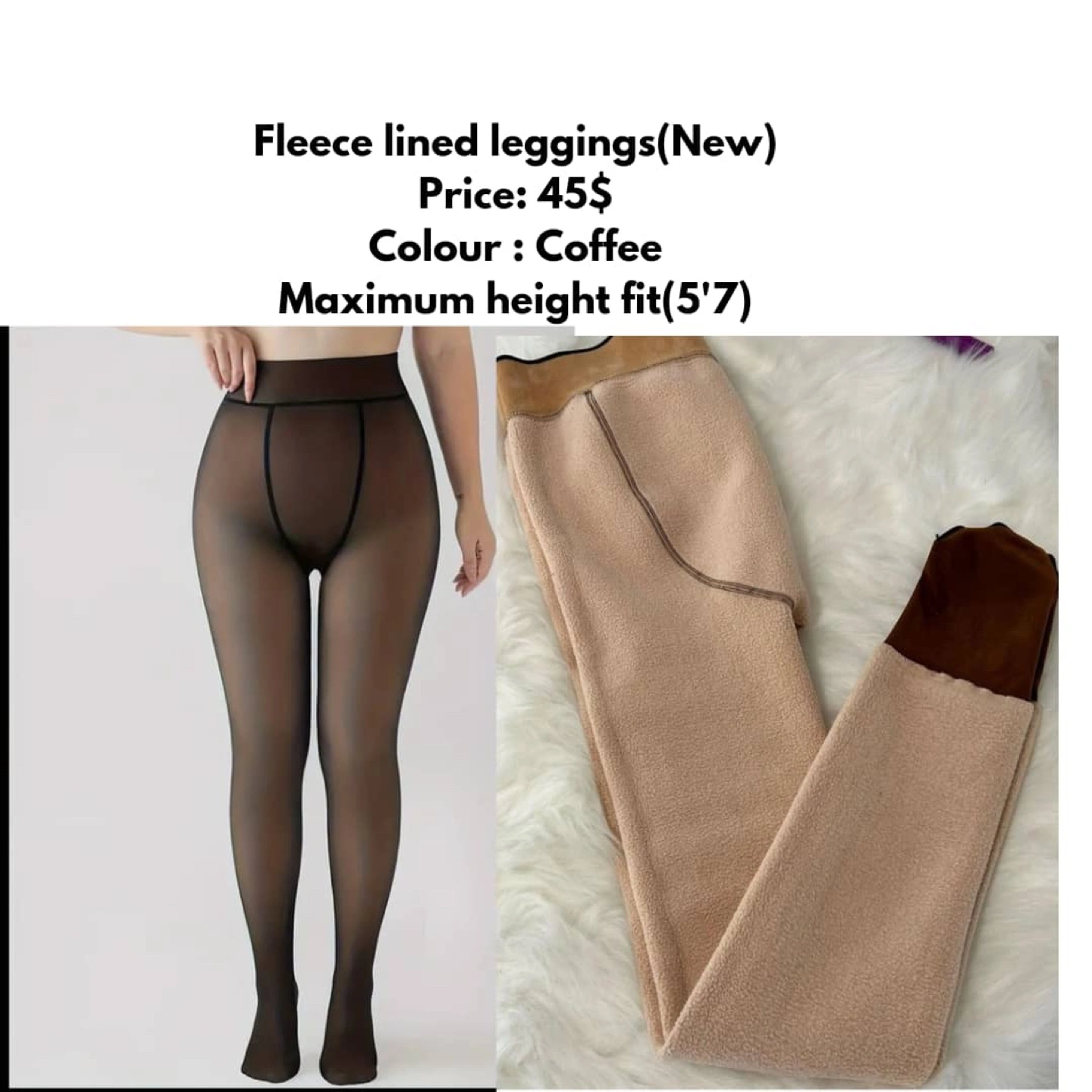 53Perfect for winter Fleece lined leggings. New. Up to -15 degrees. Coffee colour. Maximum height 5'7. Includes one pair.