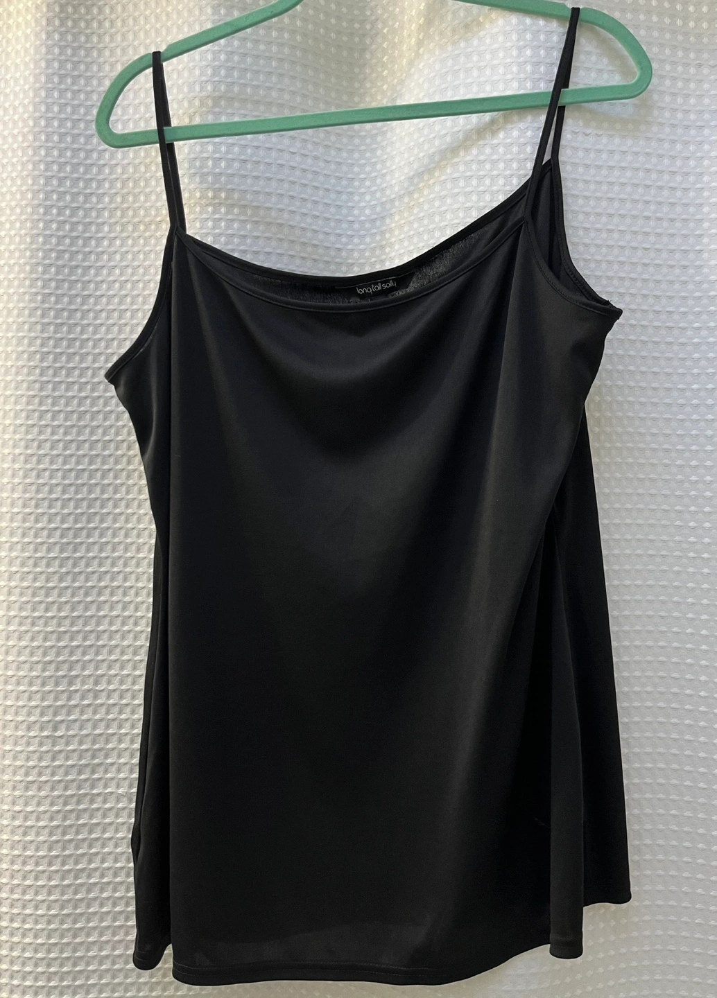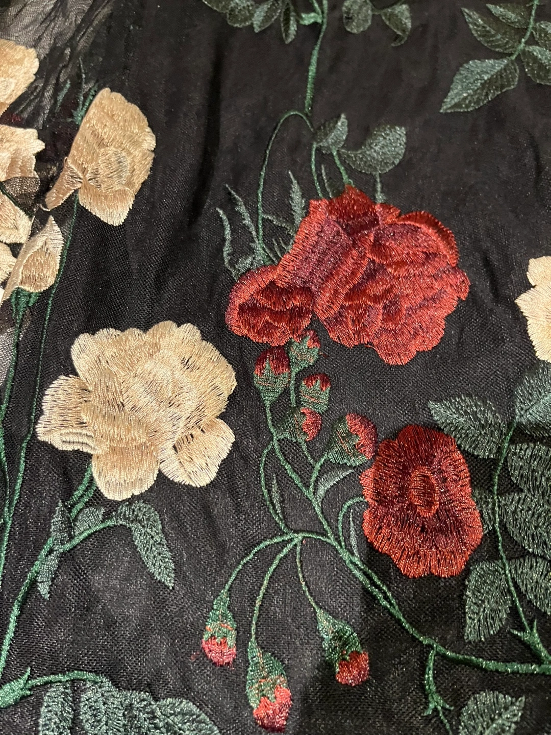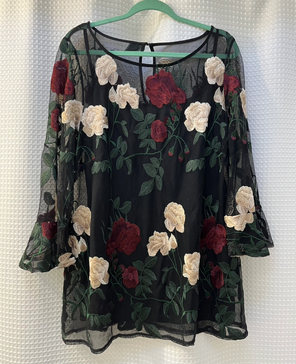 Beautiful black tunic. Features embroidered roses in cream and burgundy. Comes with long slip/camisole. Three-quarter sleeves. Relaxed fit. Lightweight and flowy.