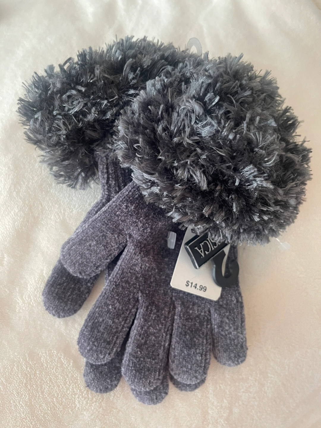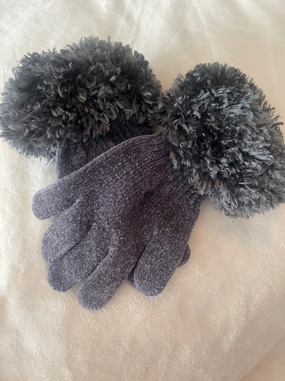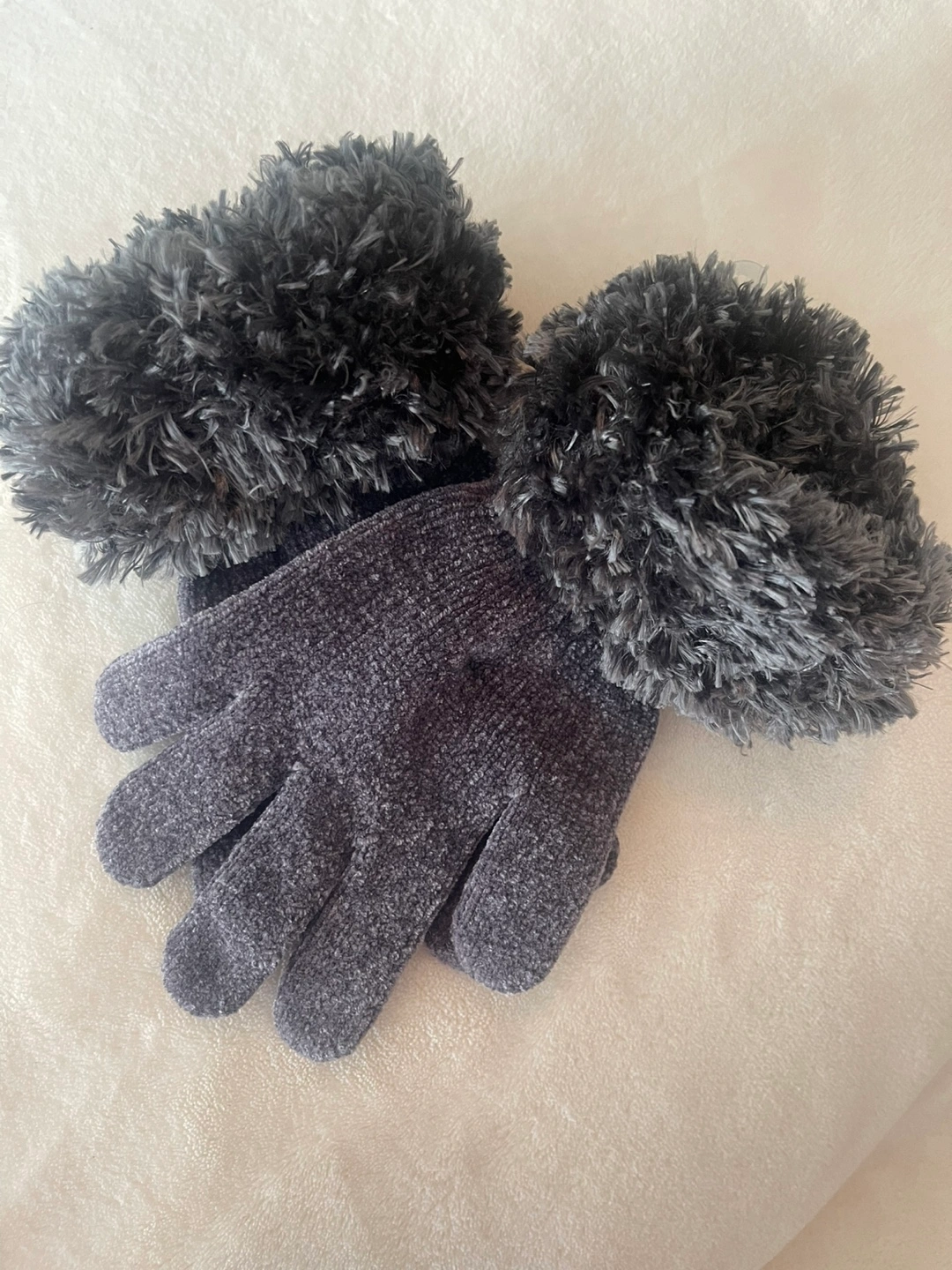 33Pair of charcoal grey knit gloves. Features fuzzy cuffs. Soft and warm. Perfect for winter.