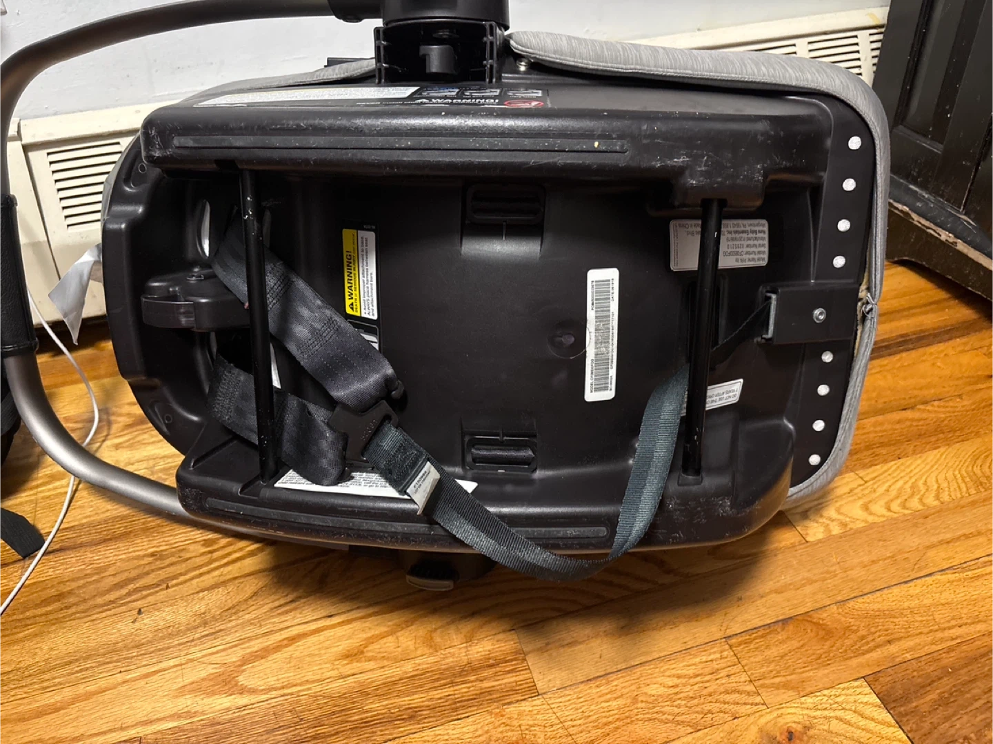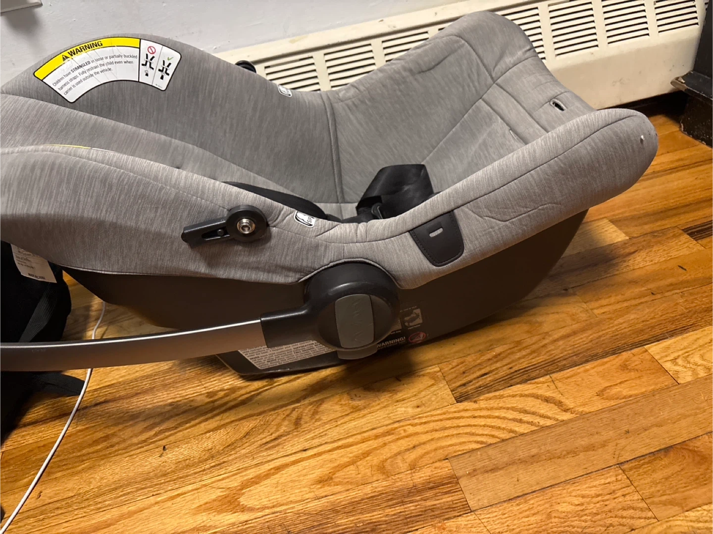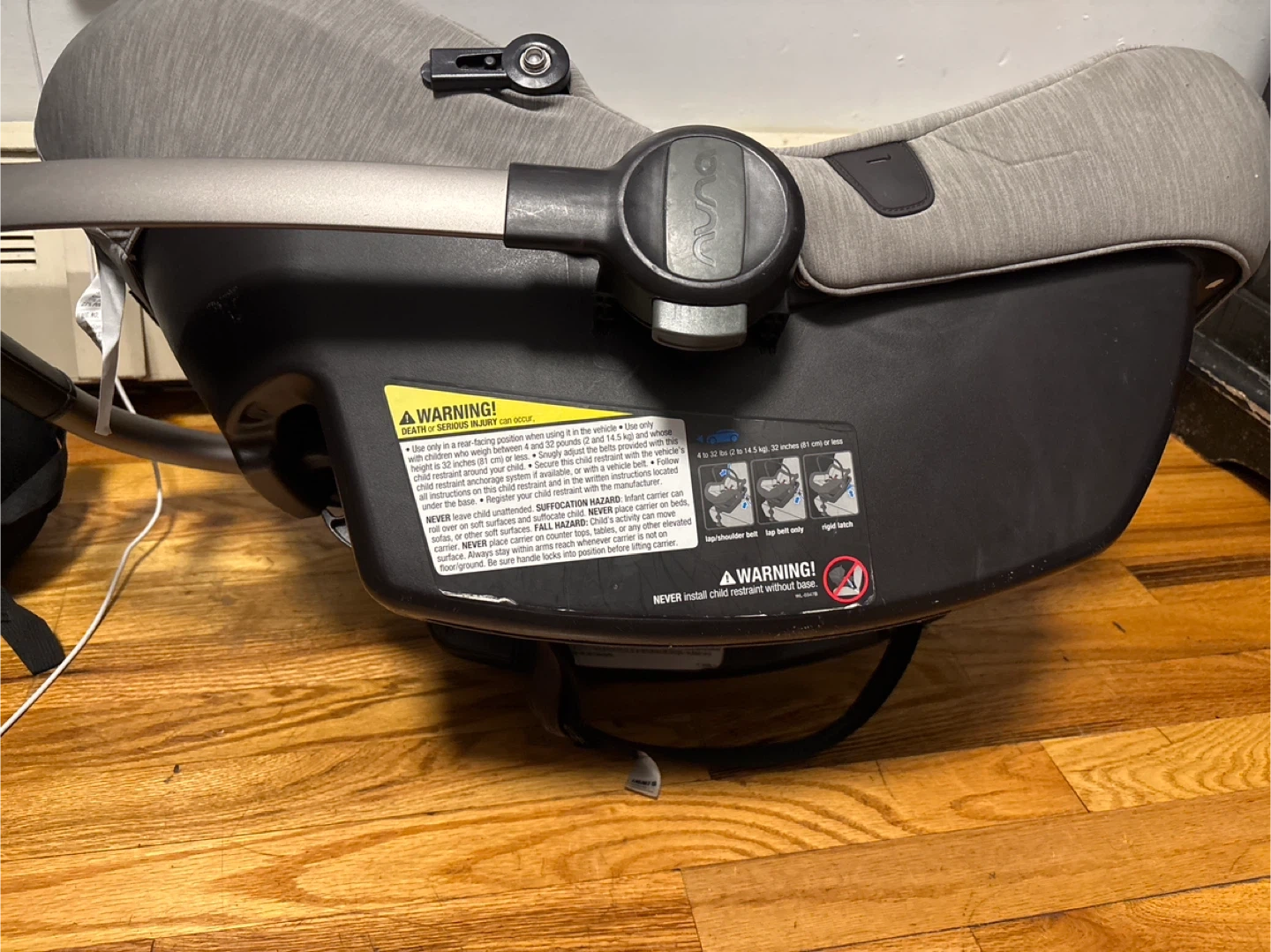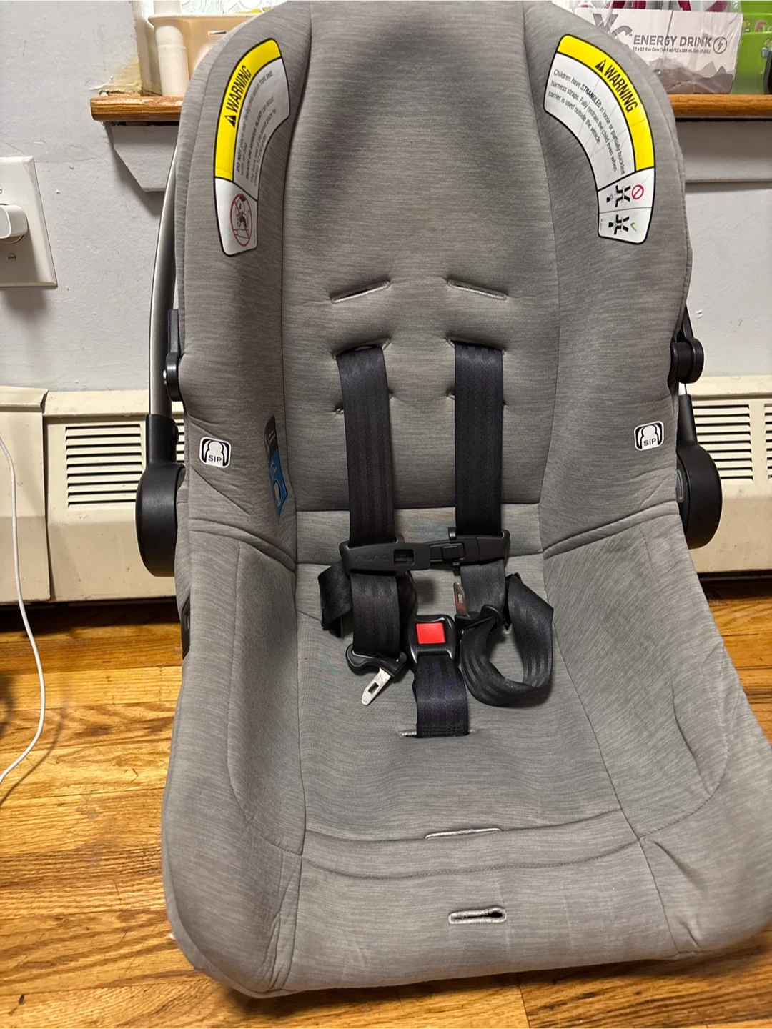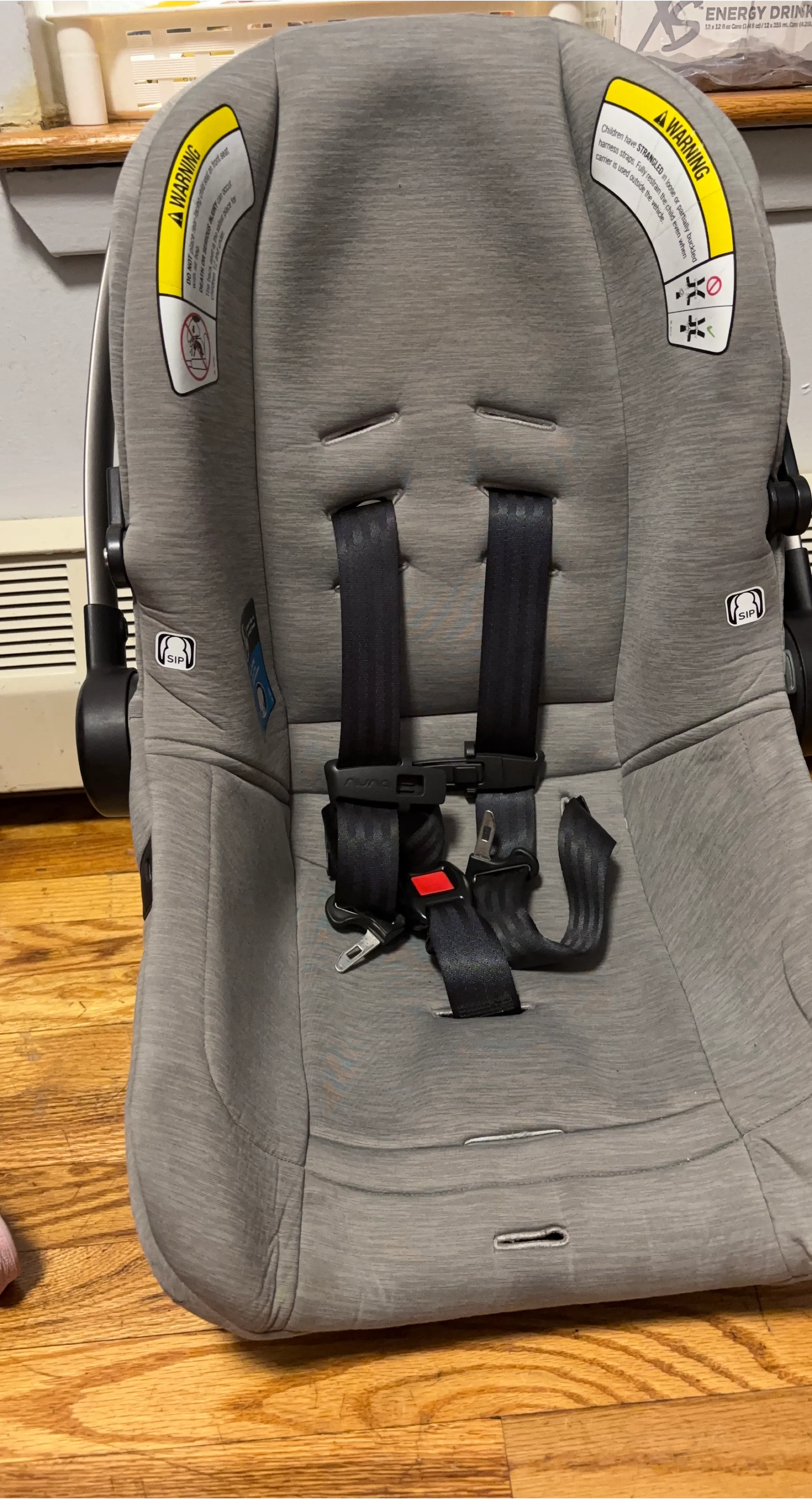 This is a Nuna PIPA infant car seat in gray. It features a 5-point harness system with SIP technology for side impact protection. This seat's fabric is a heathered gray.