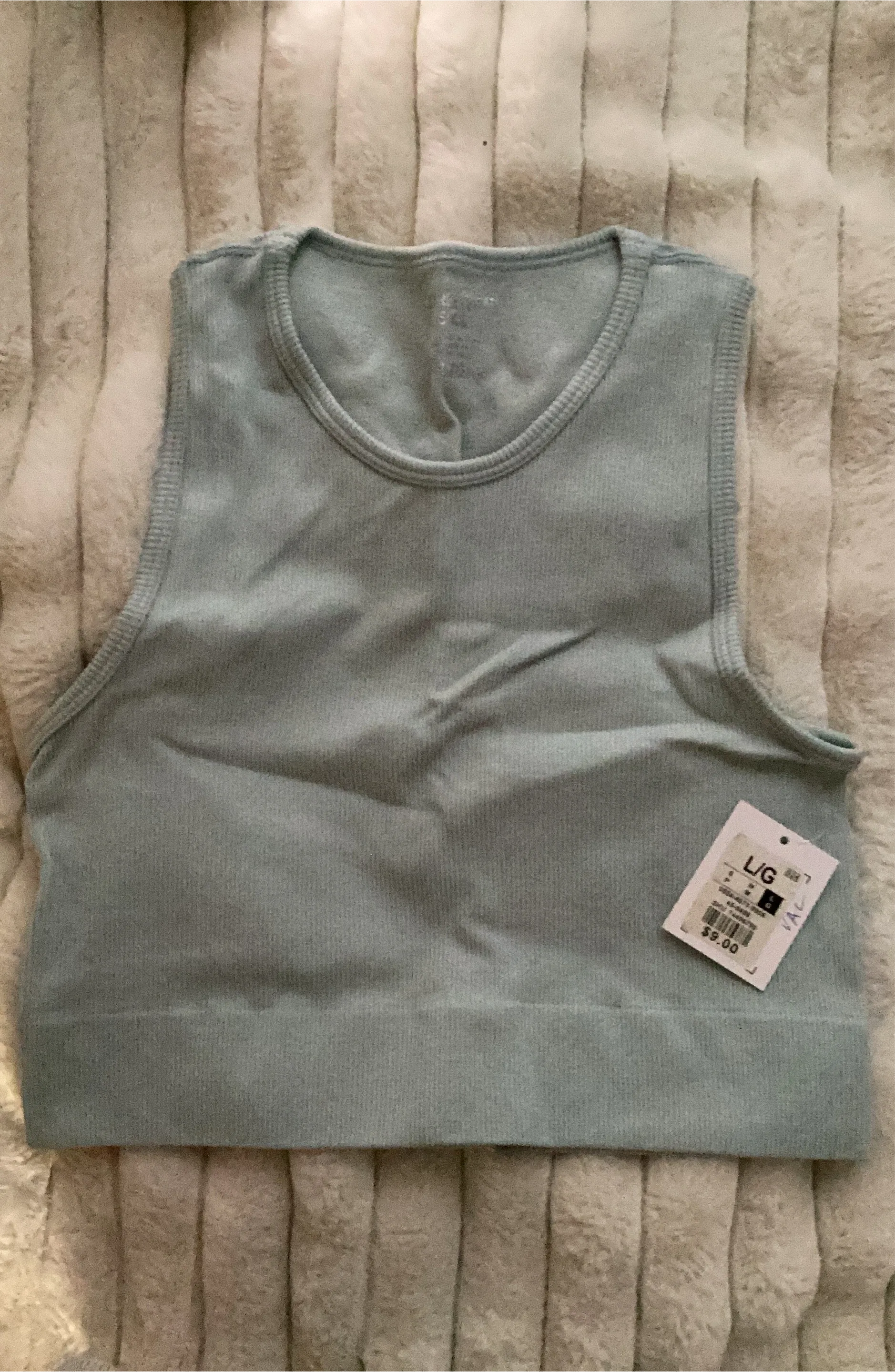 Ribbed tank top in a light blue colour. It's a size large (L/G). Made with a comfortable, stretchy material.