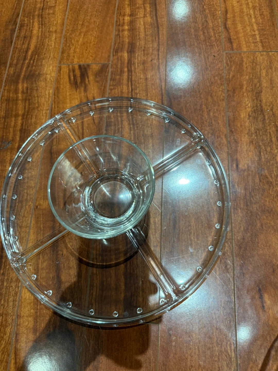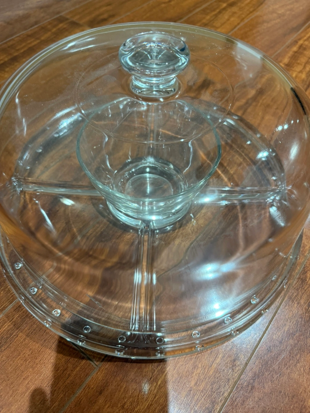 1000+Clear glass serving platter, divided into four sections. Includes a central small bowl and a clear glass dome lid. Perfect for appetizers or desserts.
