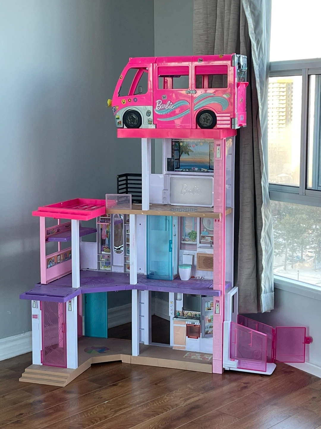 Multi-level Barbie Dreamhouse. Includes camper van accessory. Lots of rooms and features. Great for imaginative play.