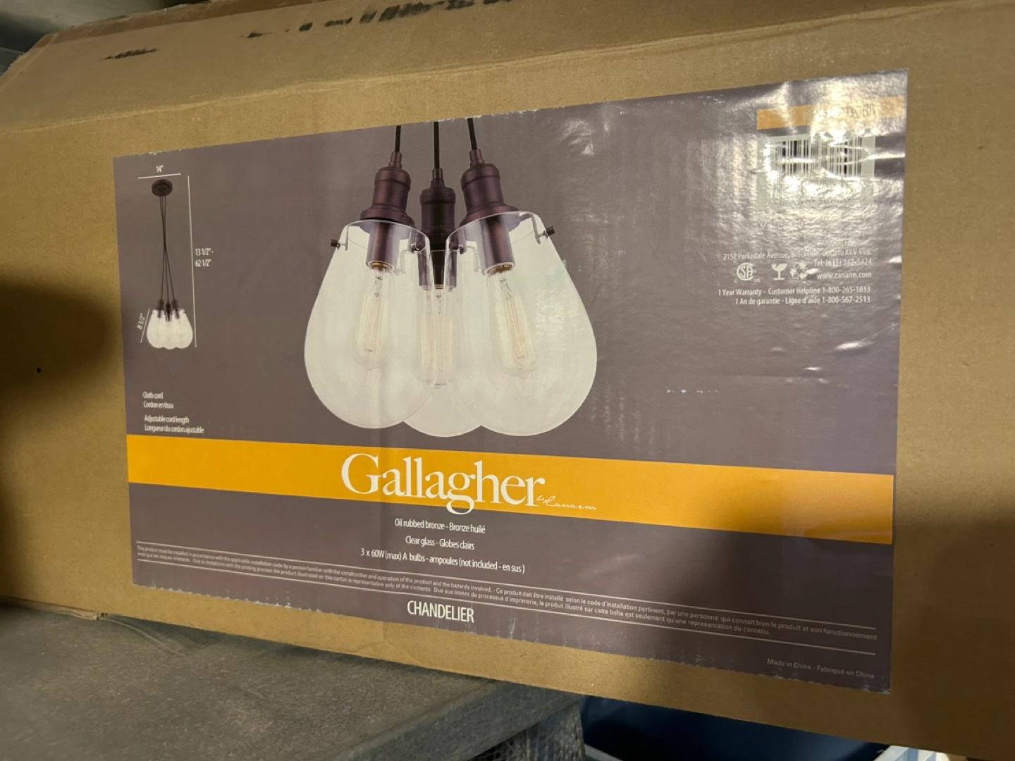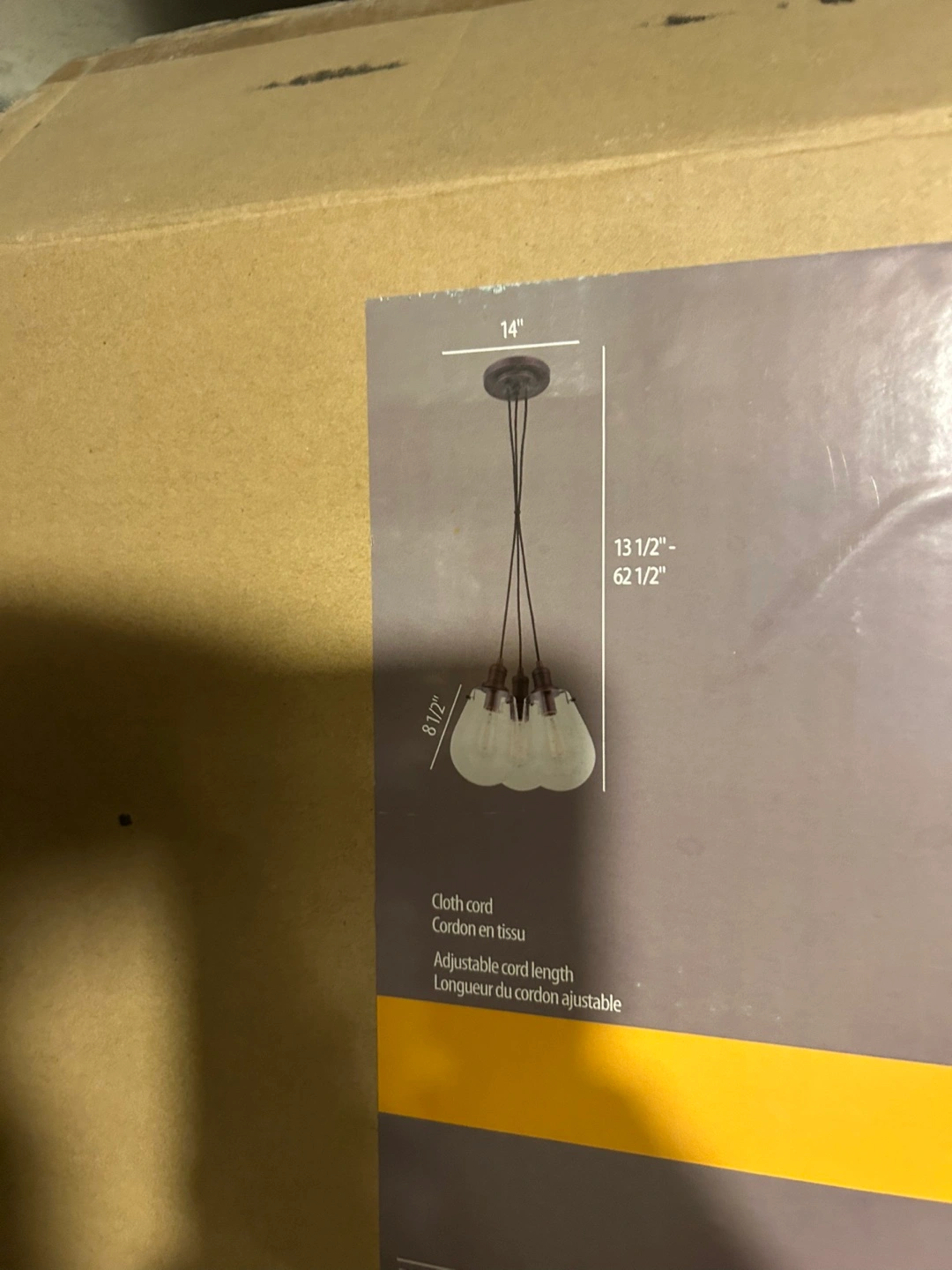 Brand new in box. Three-light chandelier. Adjustable cord length. Clear glass shades. Bronze finish. Put up for customer and customer did not like it but I just the wire to hang down for a 8’ ceiling so selling $50