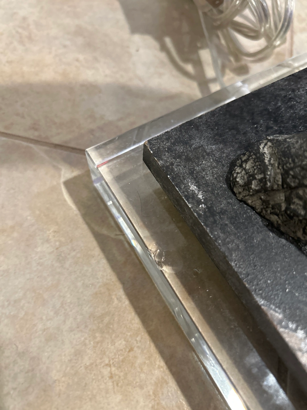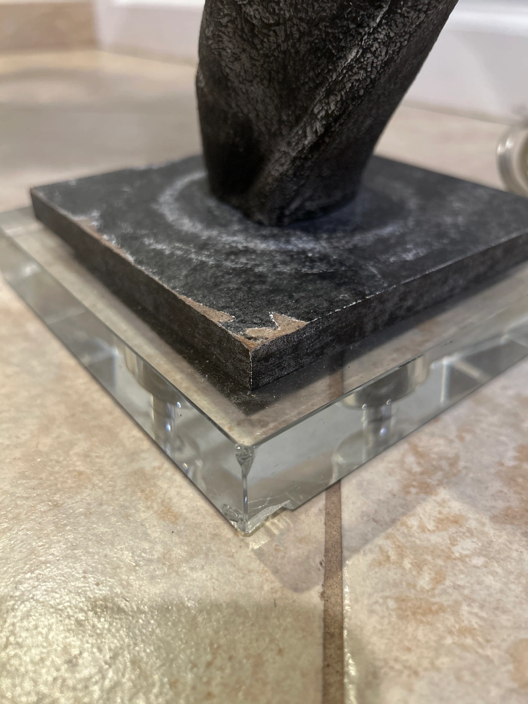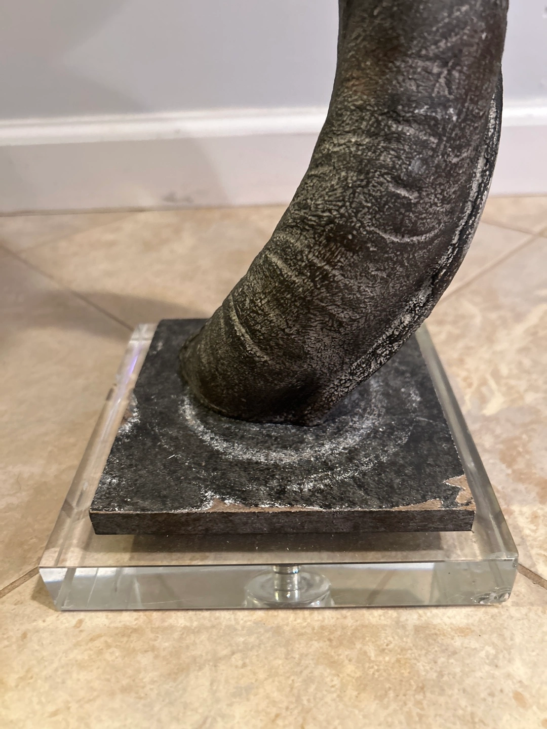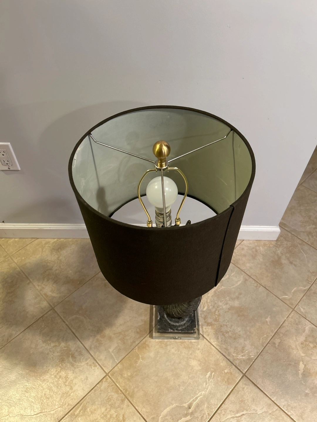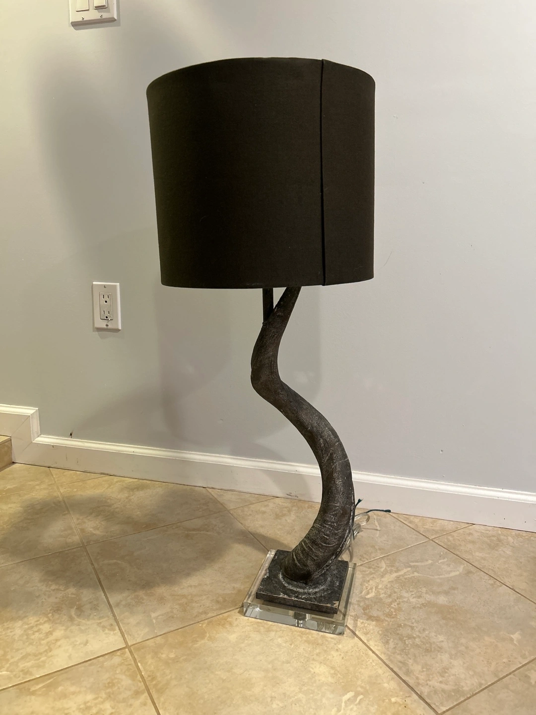 Table lamp features a twisted Kudu horn-like base. Dark brown fabric shade. Clear acrylic base. Minor wear to the base.