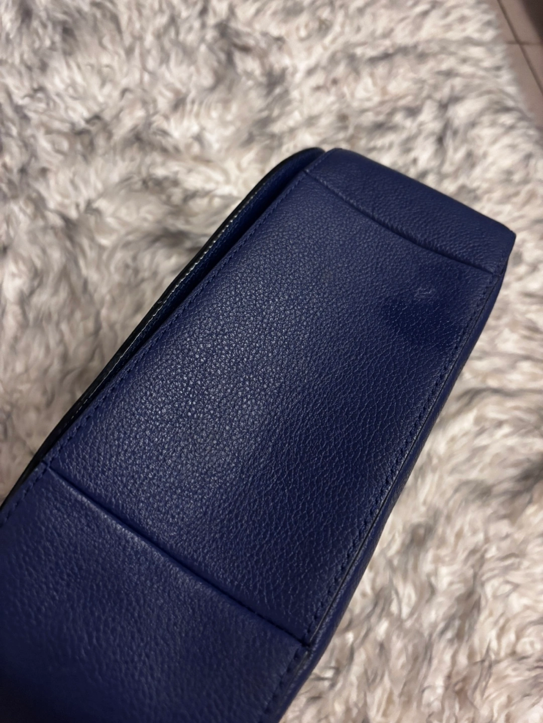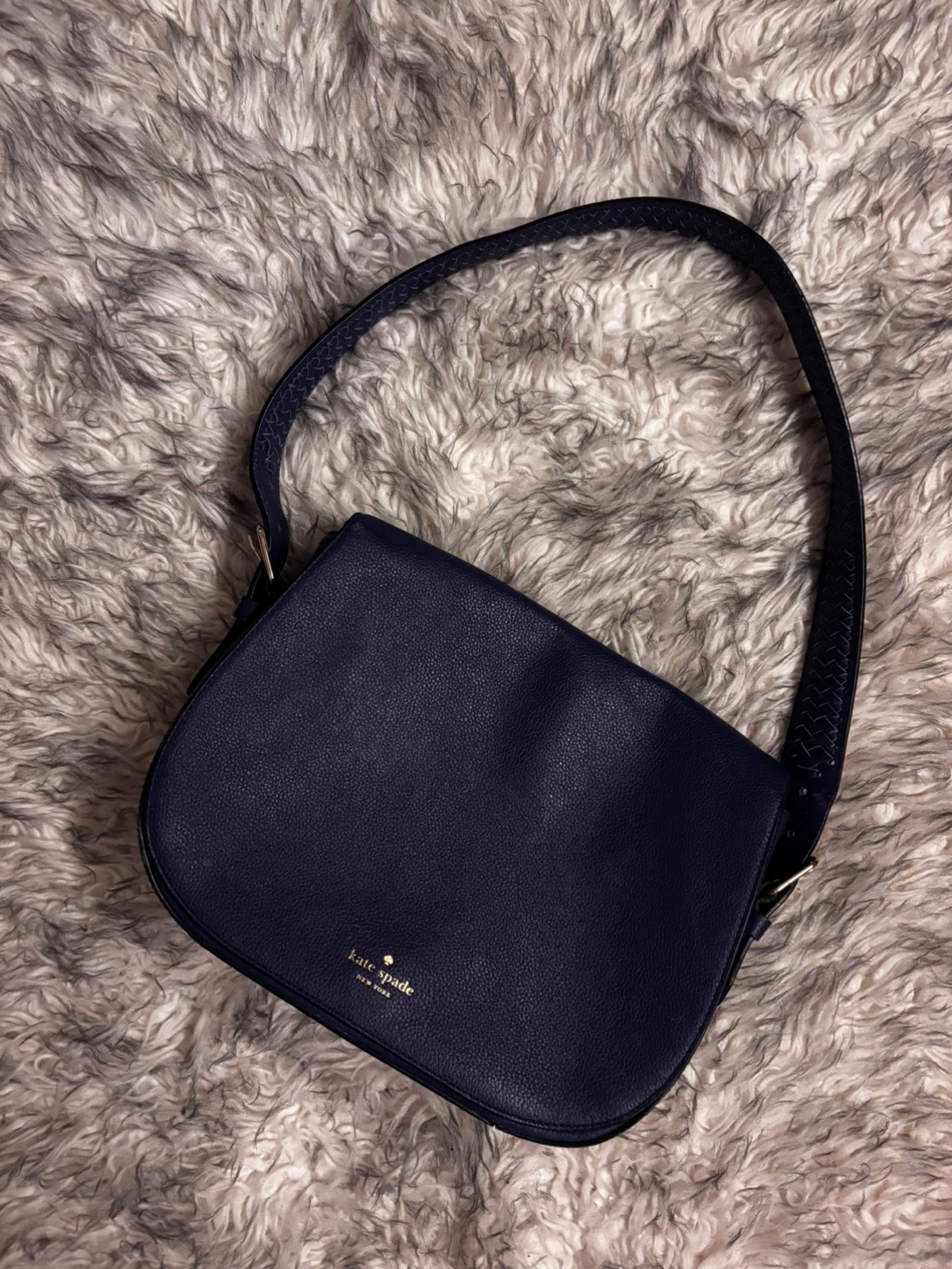 Pre-owned navy blue leather shoulder bag. Features a braided strap and gold buckle. Excellent condition, no scratches.