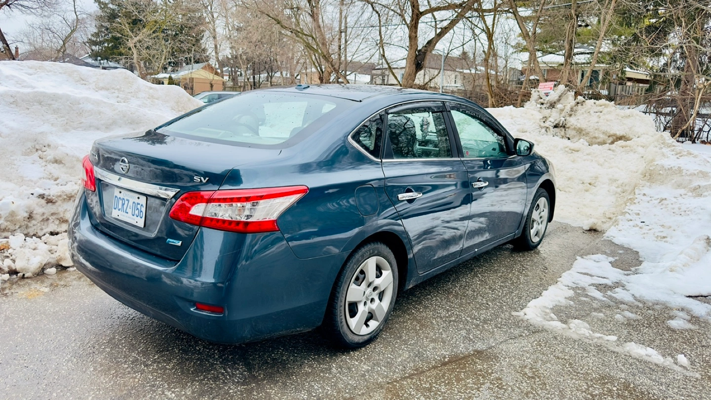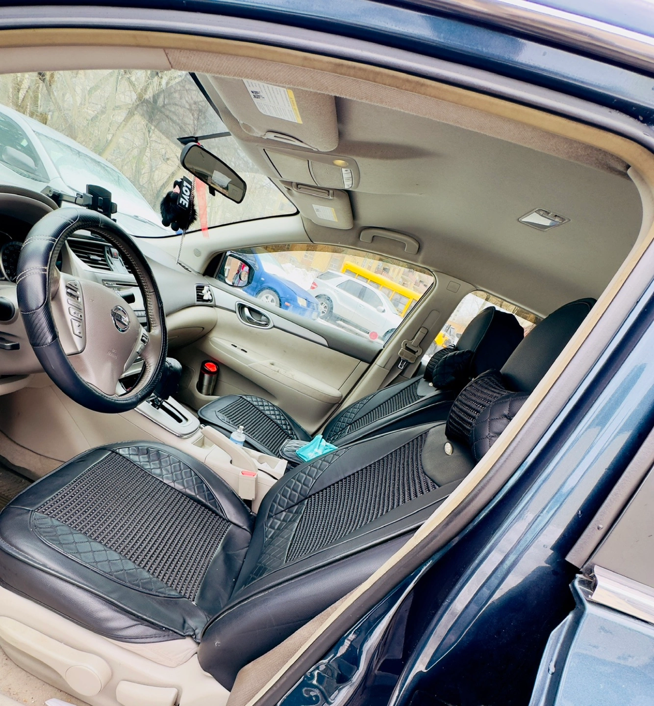 65Pre-owned Nissan Sentra. Dark blue exterior. Black leatherette interior with diamond-pattern seat covers. Automatic transmission. Clean title.