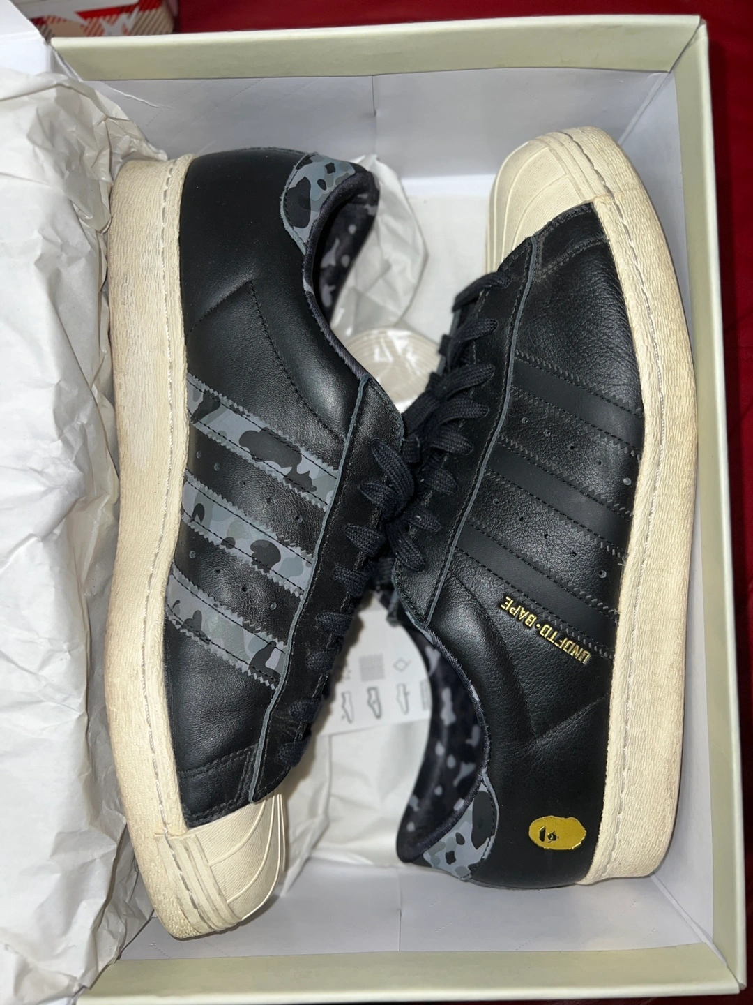 5Black leather sneakers. Off-white sole. Camo print interior. BAPE logo on heel.
