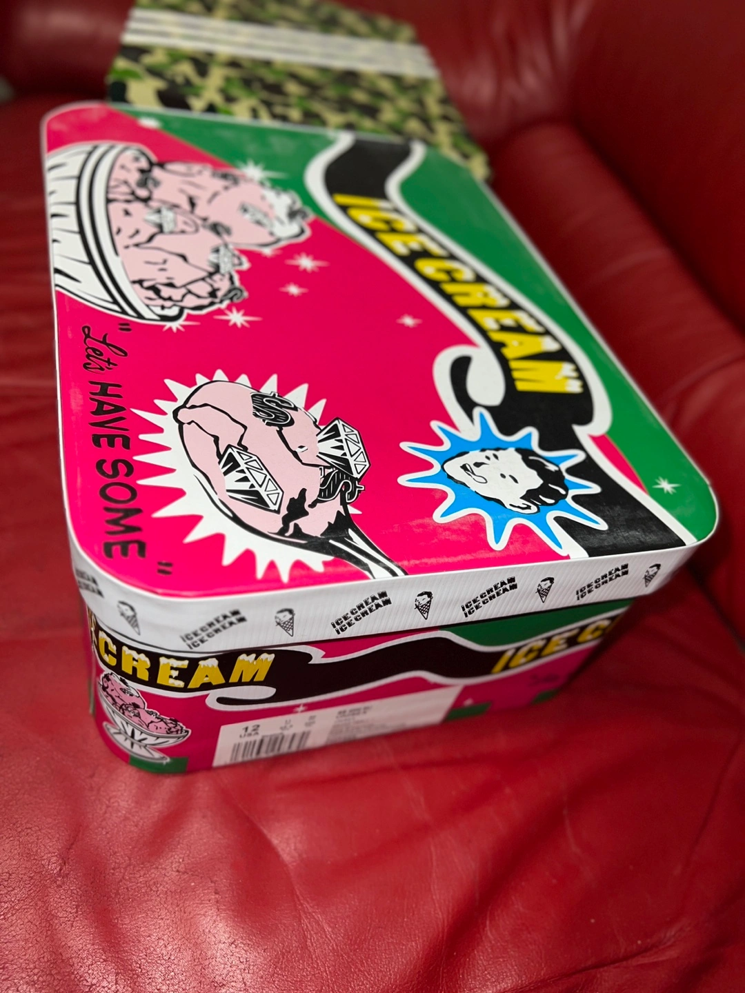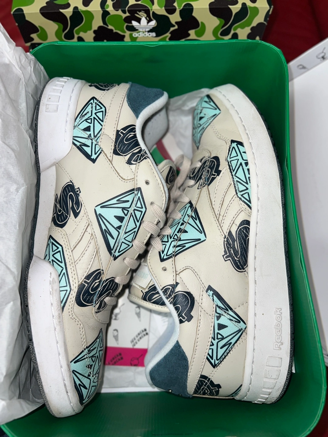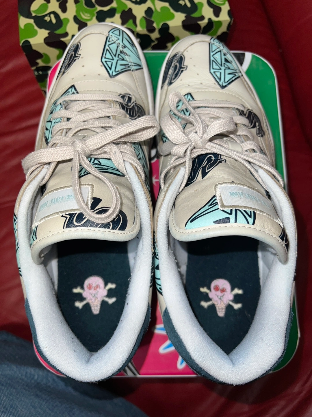 5Limited edition sneakers. Cream coloured base with teal and black accents. Diamond and money bag print. Comes in original Ice Cream box. Size 12.