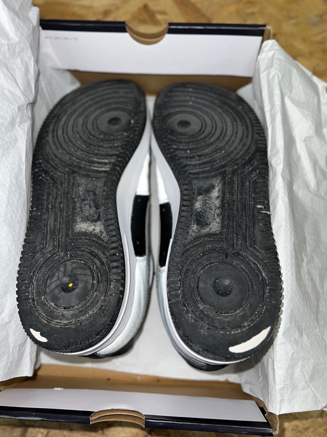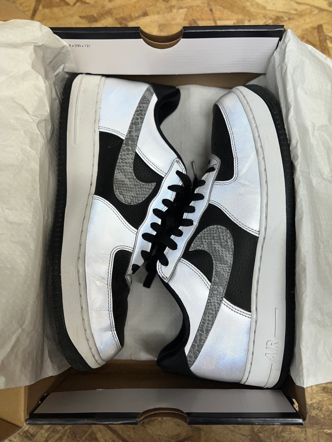 5Men's Nike Air Force 1 '07 LV8 sneakers. Black, grey, and reflective silver colourway. Low-top style. Snakeskin print detailing. In original box.