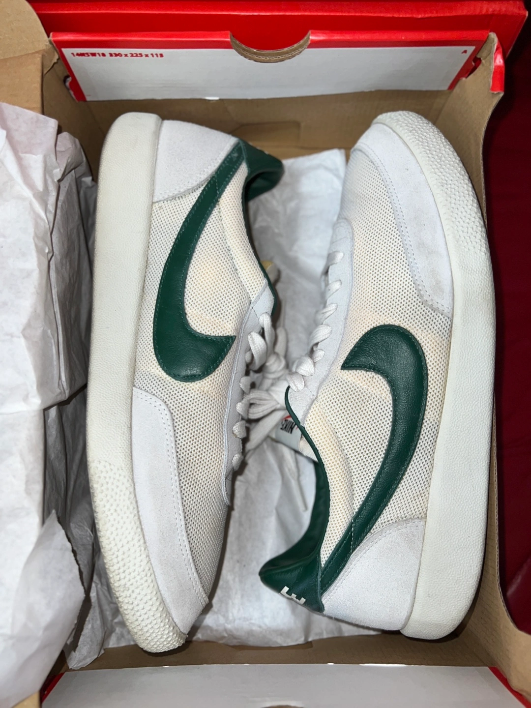 5Pair of low-top sneakers. White leather and mesh upper. Green Nike swoosh. Classic design. In original box.
