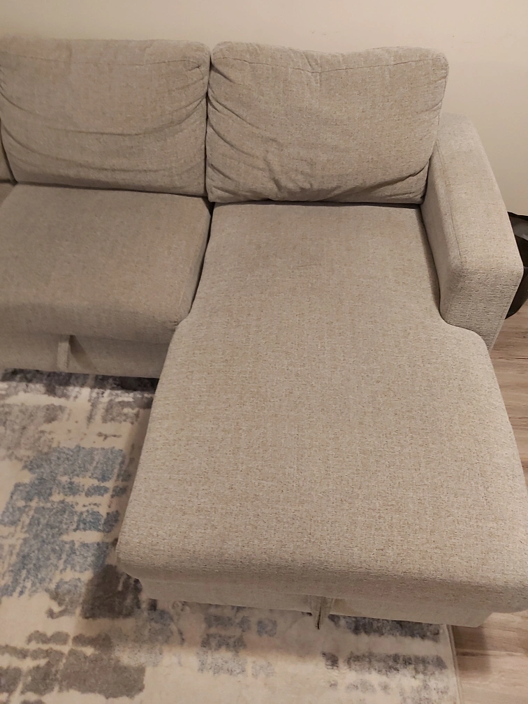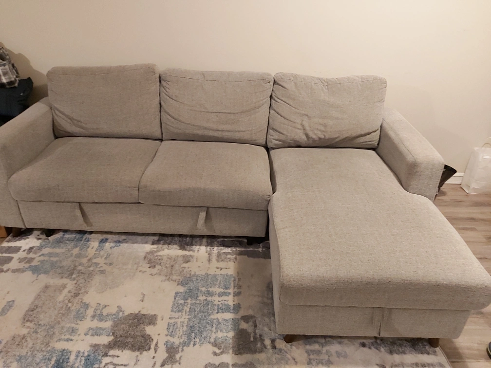 Light grey fabric sectional sofa. Includes pull-out bed. Three seat cushions. Excellent for small spaces. Pick up only.