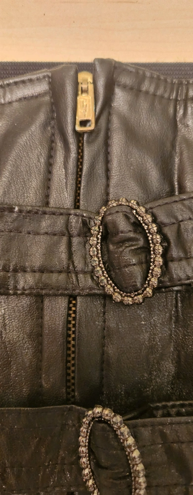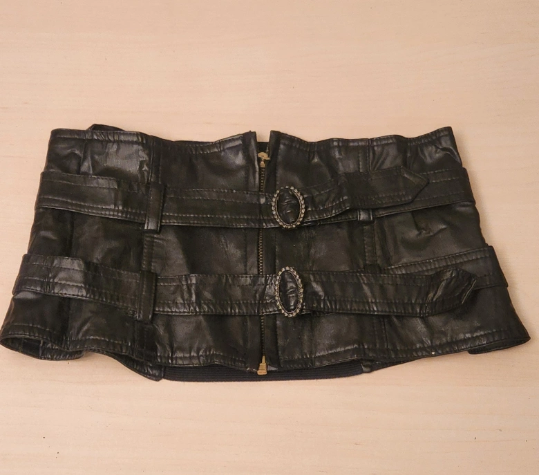 354Black faux leather corset belt. Features decorative buckles and a zipper closure. Stretchy back panel. Great for cinching the waist.
