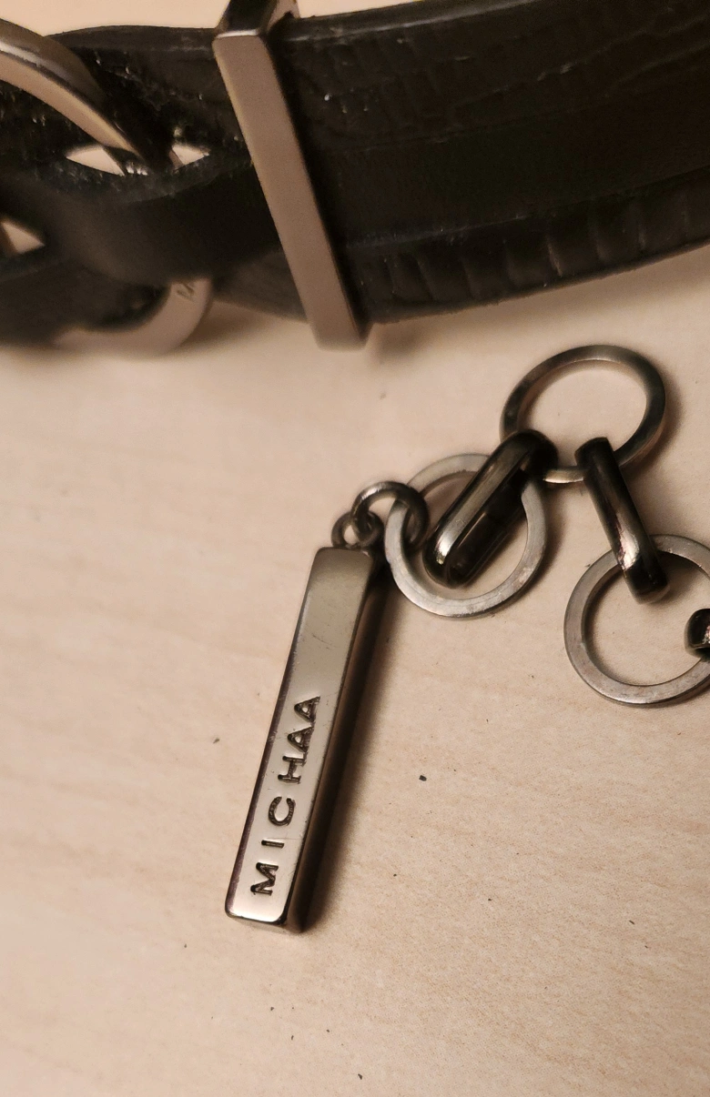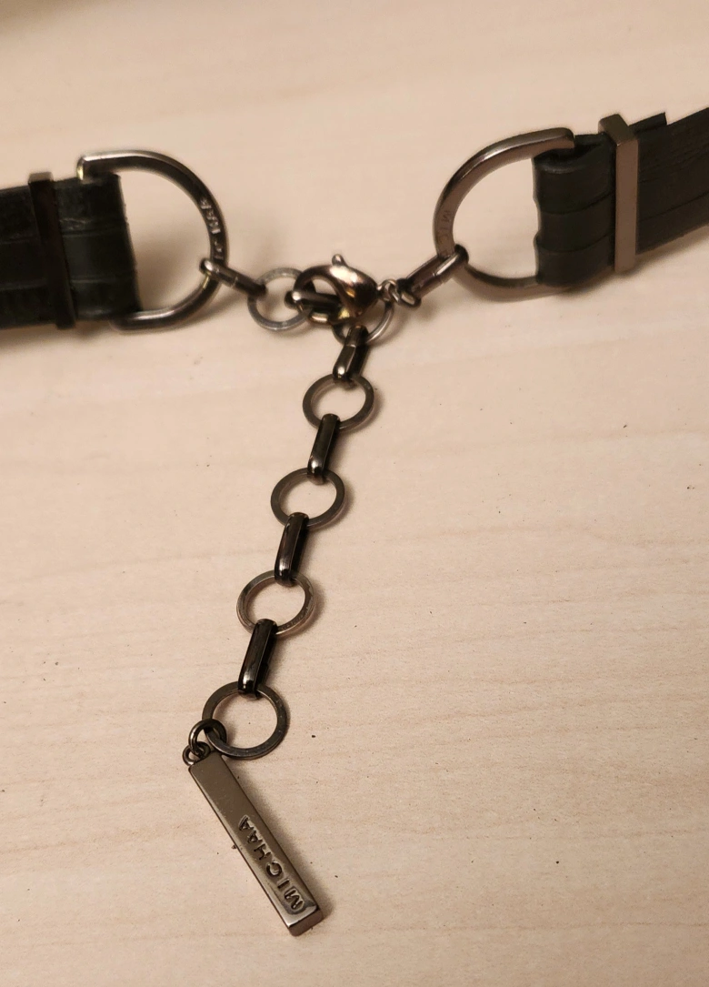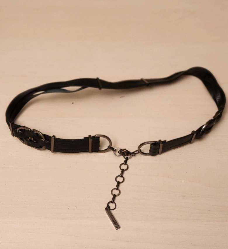 365Black leather belt. Metal accents. Chain detail. Great for adding style to any outfit.