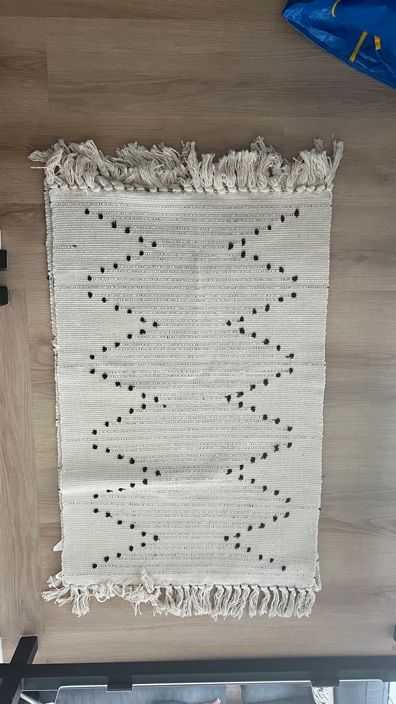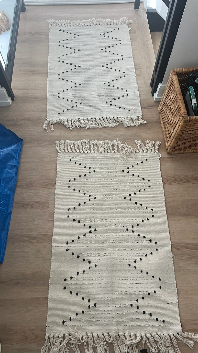 382Brand new never used. Two off-white cotton rugs. Black dotted pattern. Fringed edges. Lightweight and easy to clean. Perfect for entryway or bathroom.