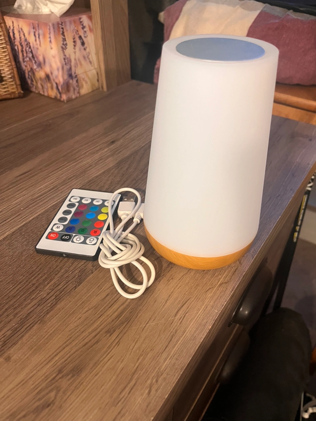 Modern colour changing lamp. Features a remote control and USB charging cable. Wooden base. Great for bedside table or nightstand.