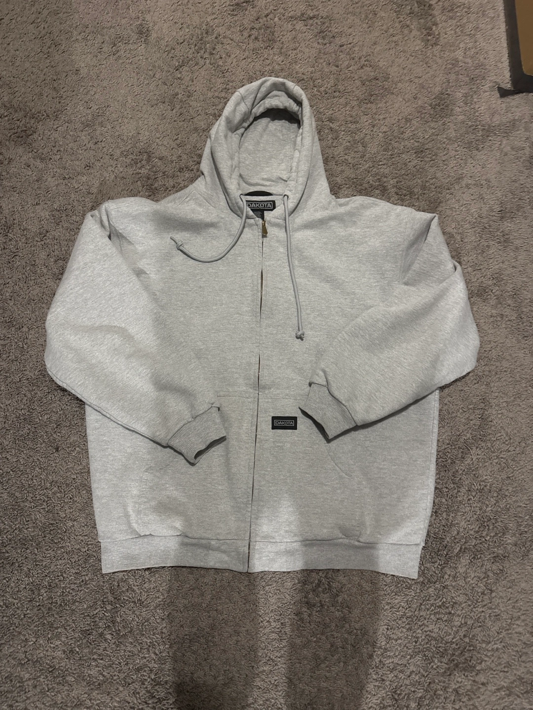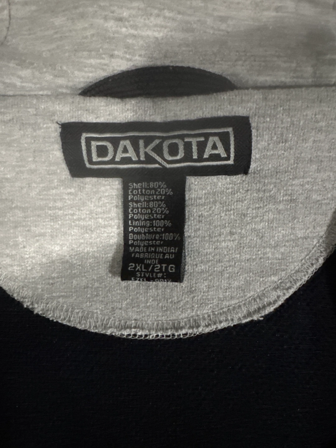 Grey heavyweight zip-up hoodie. Large front pouch pocket. Double-lined hood. 2XL size. Made in India. 80% cotton, 20% polyester shell. 80% polyester, 20% cotton lining.