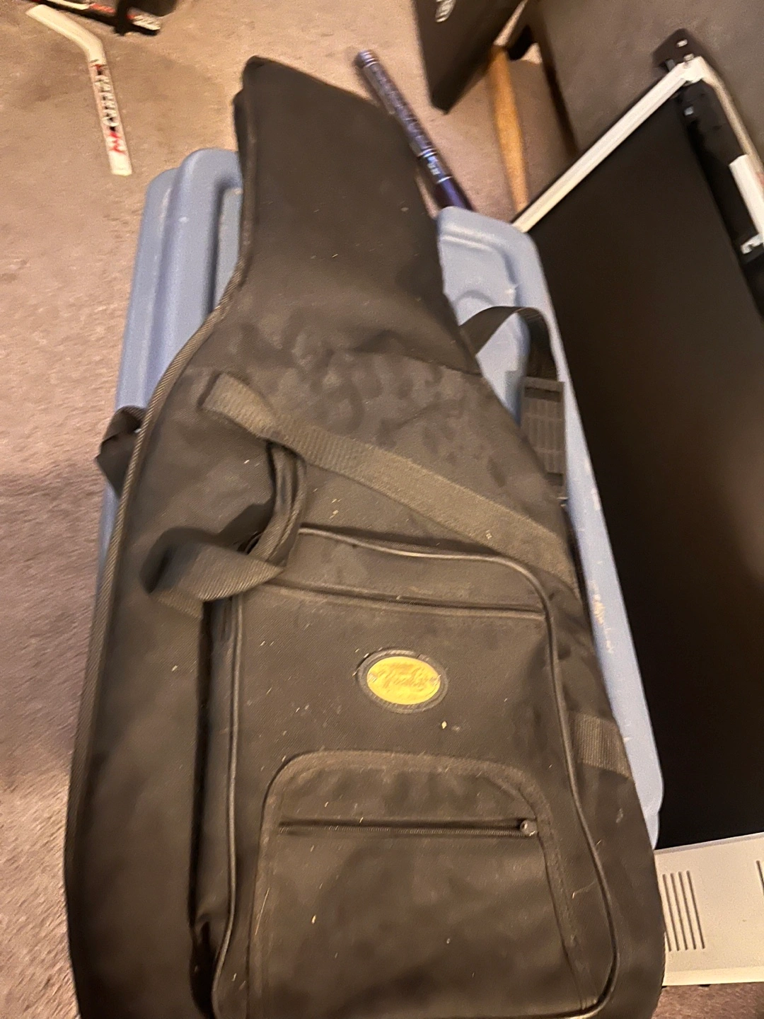 Black Fender branded gig bag. Good condition, some wear. Zipper closure and shoulder strap. Great for protecting your guitar during transport.