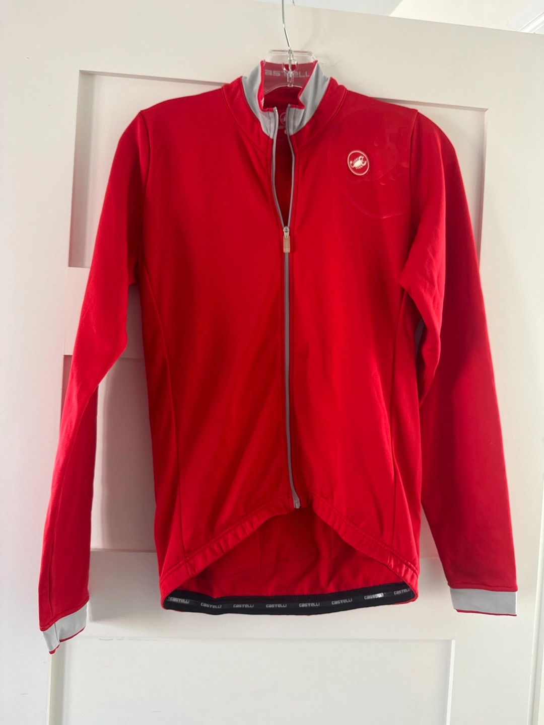 Long-sleeve cycling jersey. Red with grey accents. Full zip. Castelli branding throughout. Size small. Gently used.