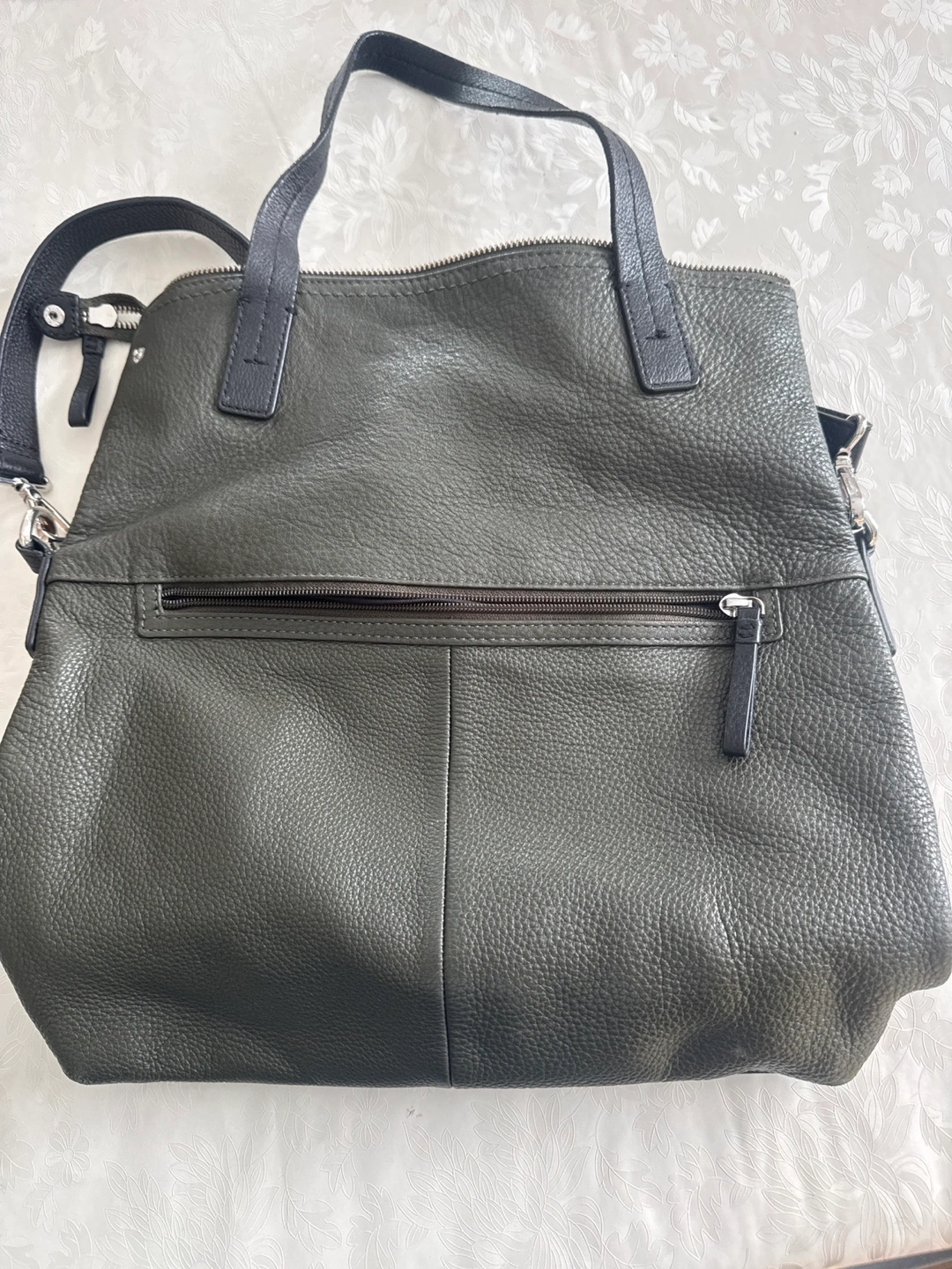 Stylish olive green leather tote bag. Features two top handles and a detachable shoulder strap. Multiple pockets inside and out. Zip closure.