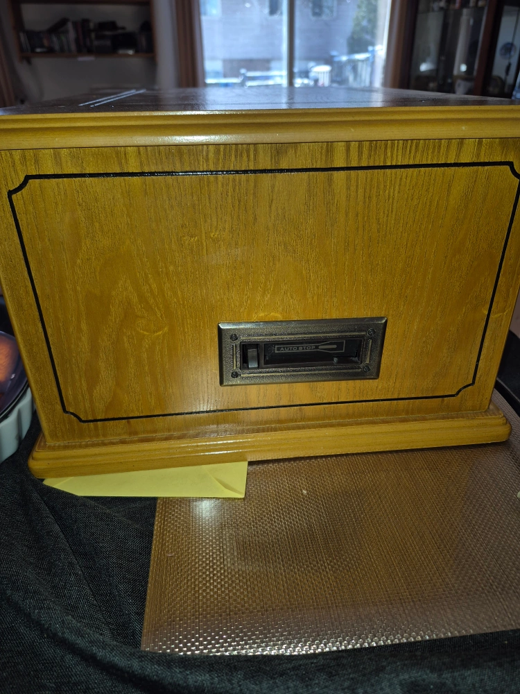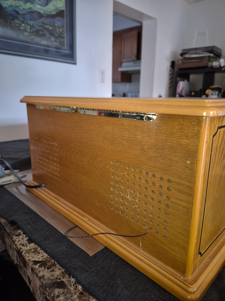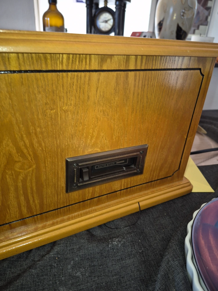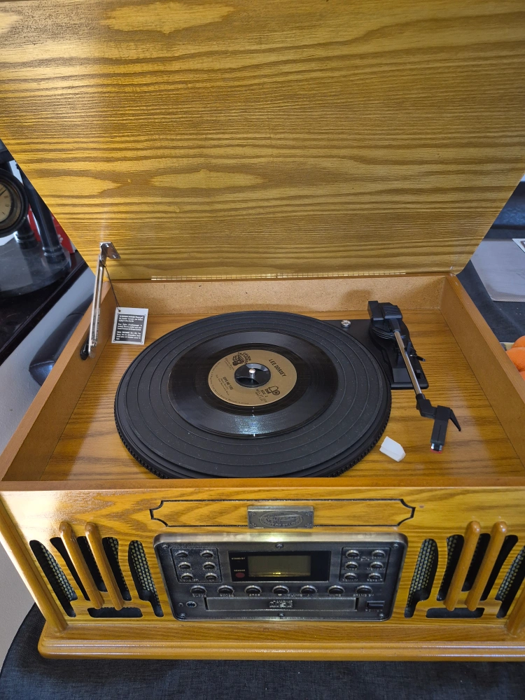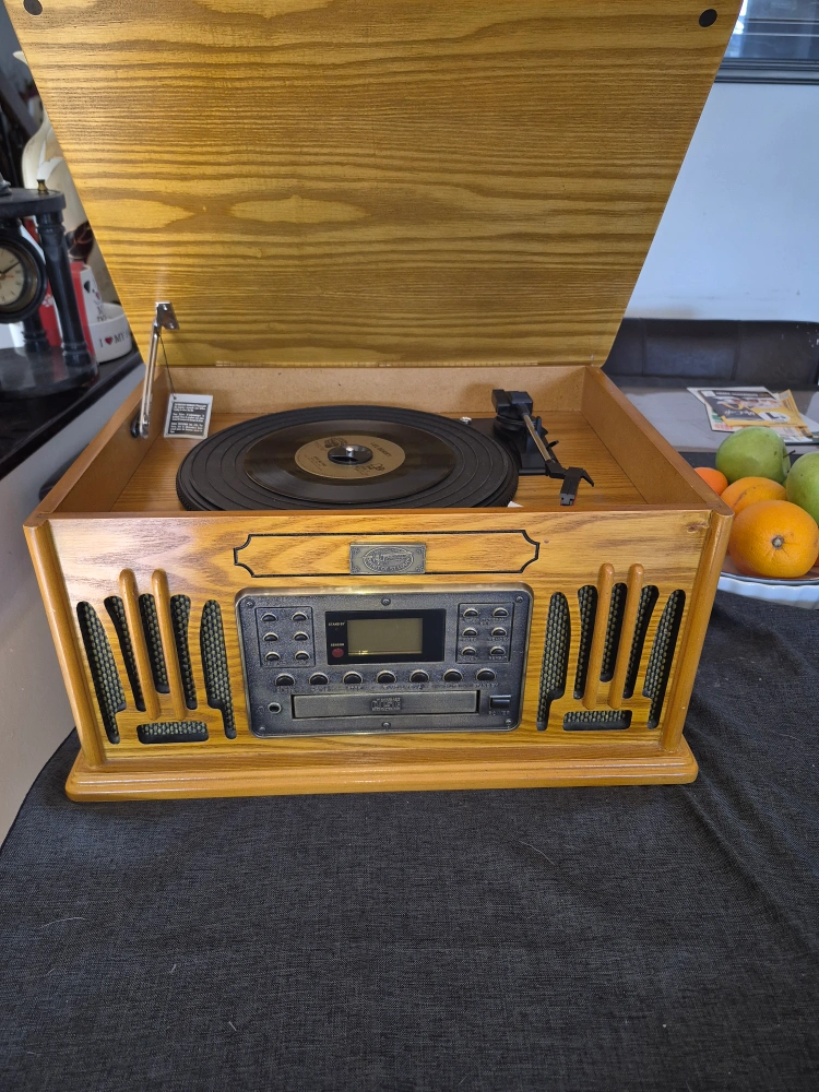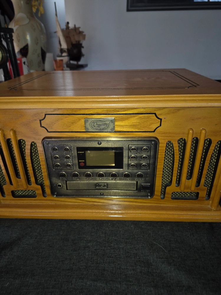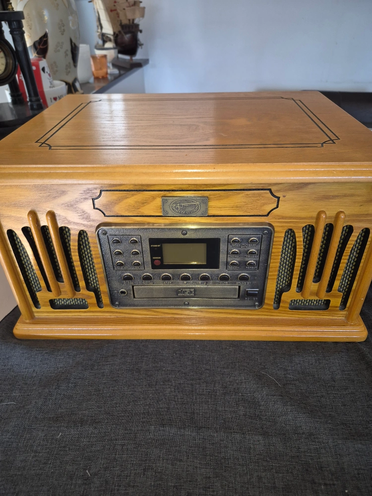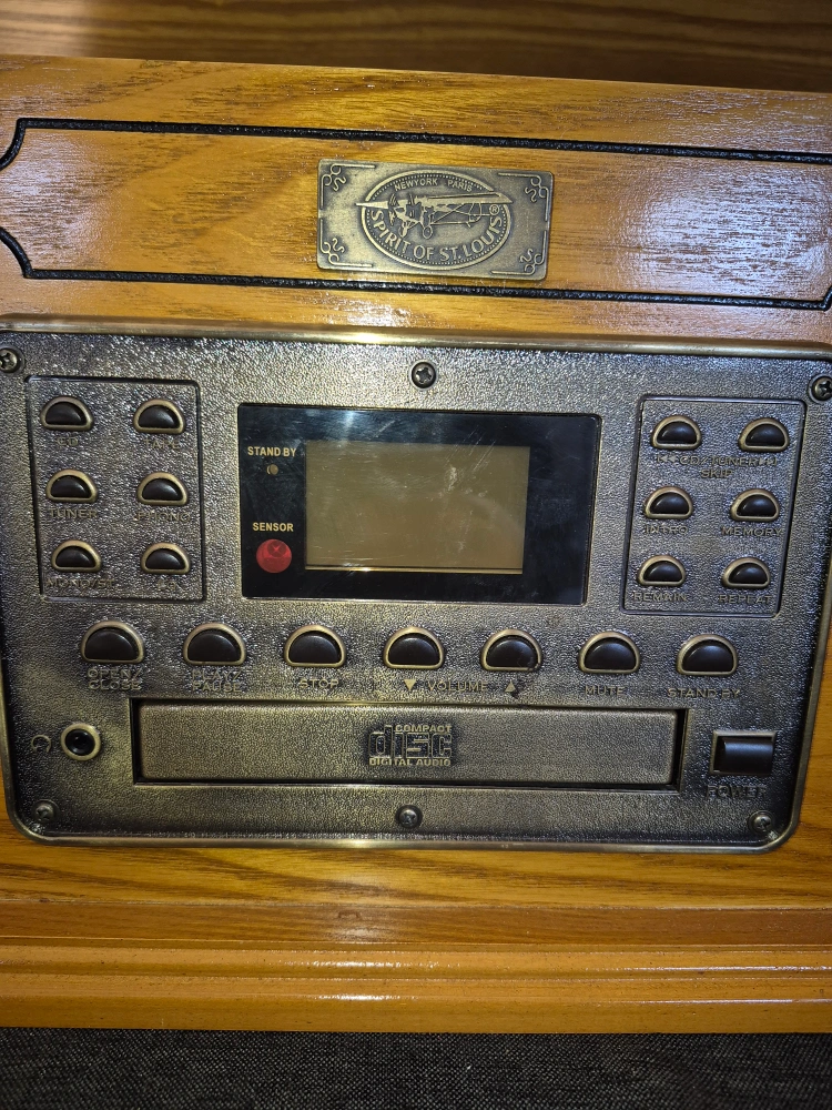 Spirit of St.Louis 4 in 1 sound system Wooden cabinet, three-speed turntable, built-in CD player, AM/FM radio. Plays 33 1/3, 45, and 78 RPM records also plays cassettes. Includes headphone jack. Great for vinyl lovers. In very good conditions. remote control included fully working
