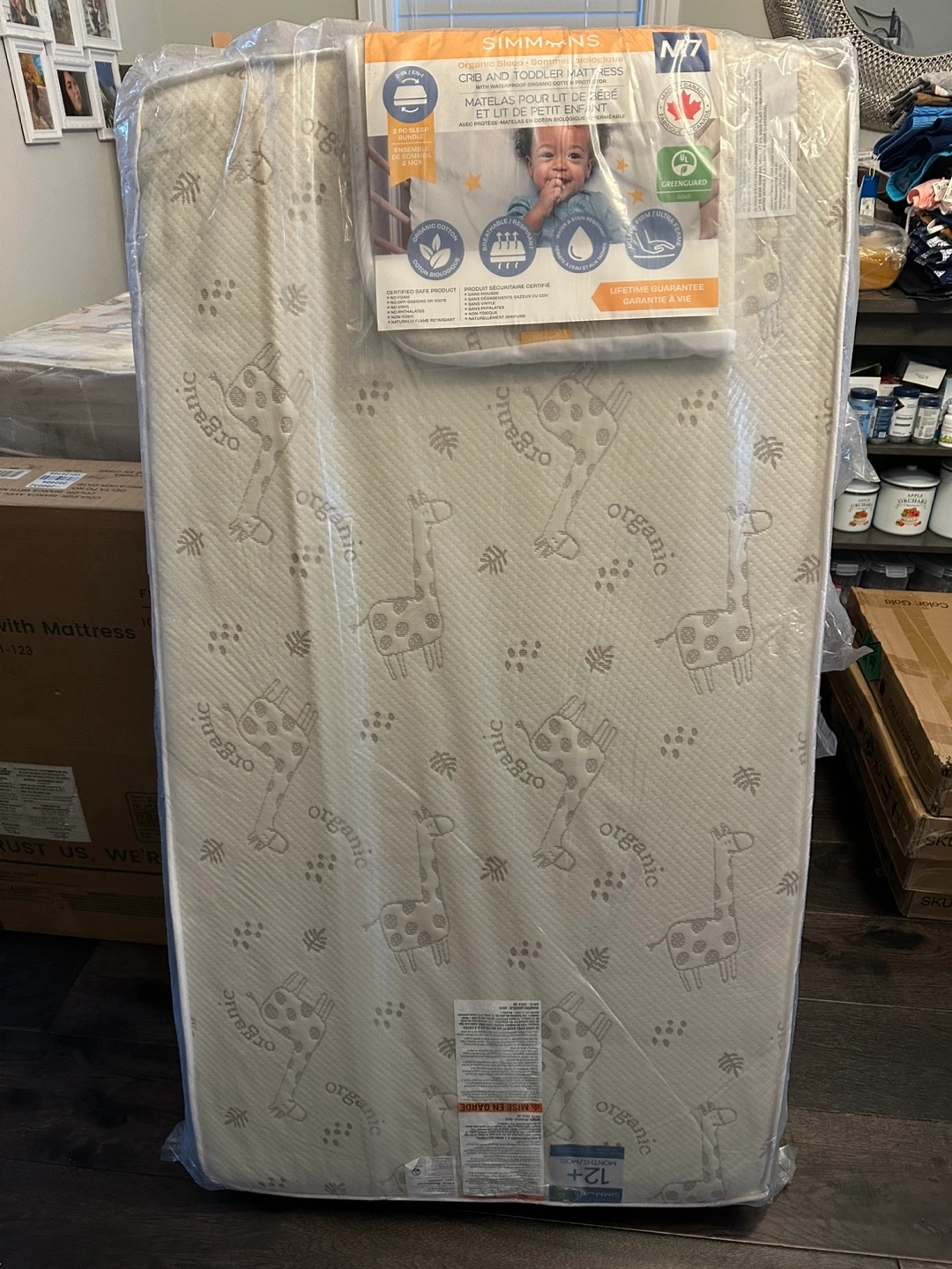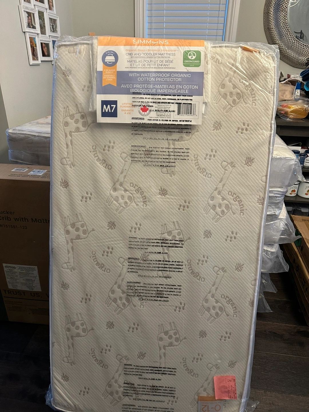 New crib and toddler mattress protector. Waterproof and organic cotton. Features a cute giraffe print. Size M7.