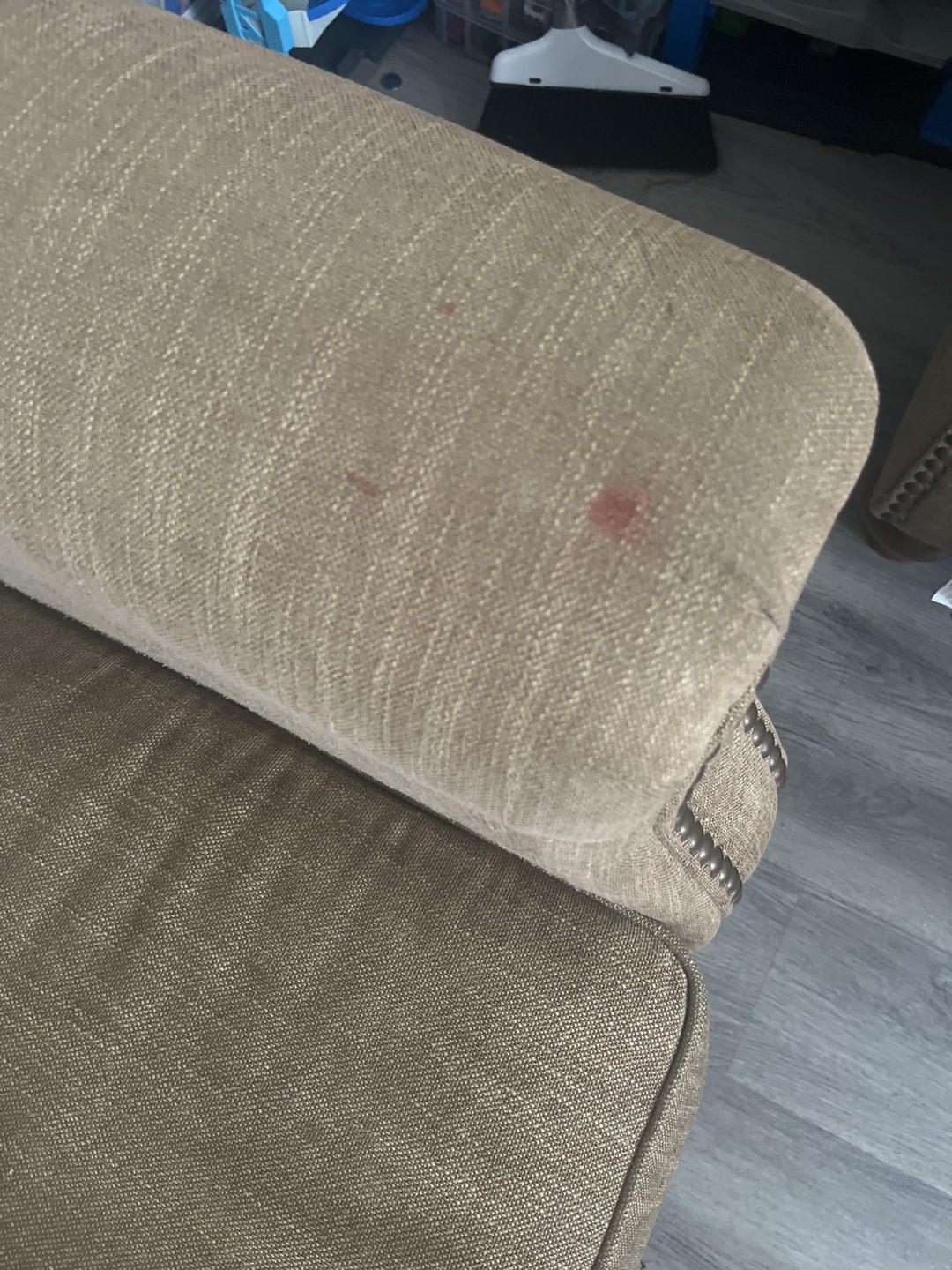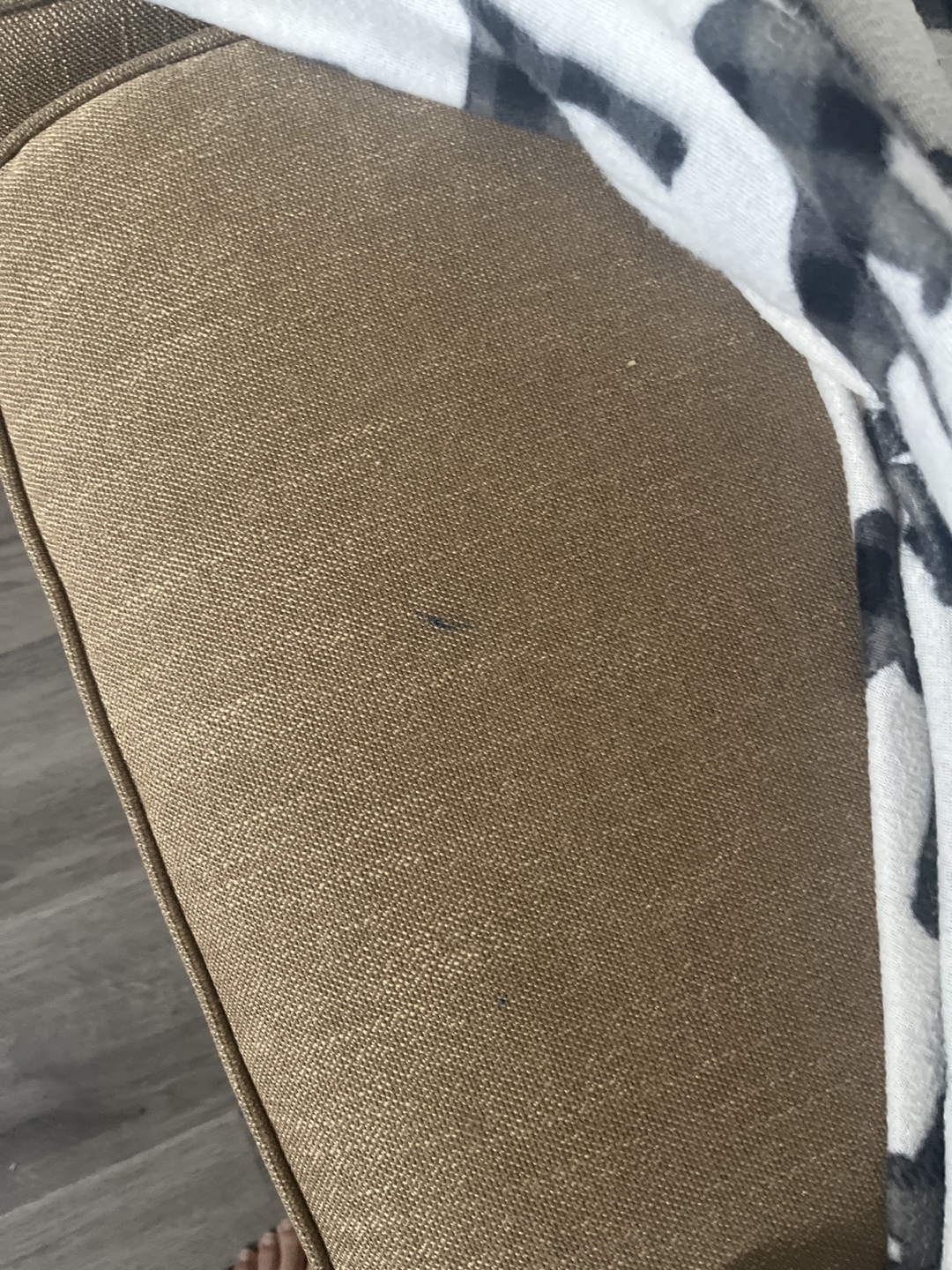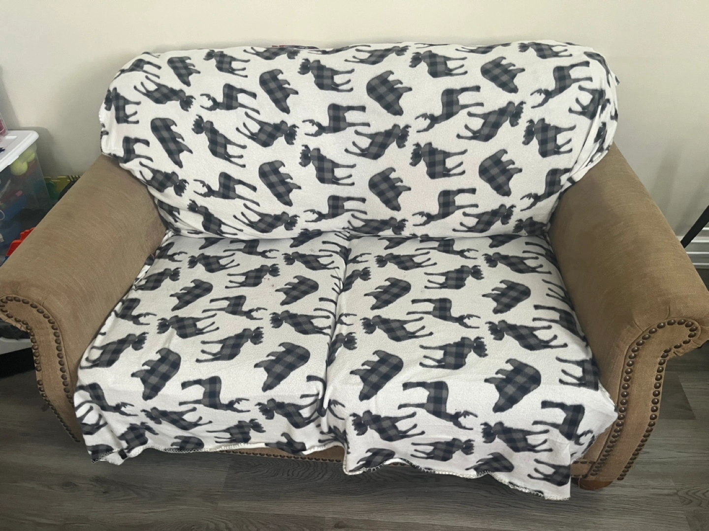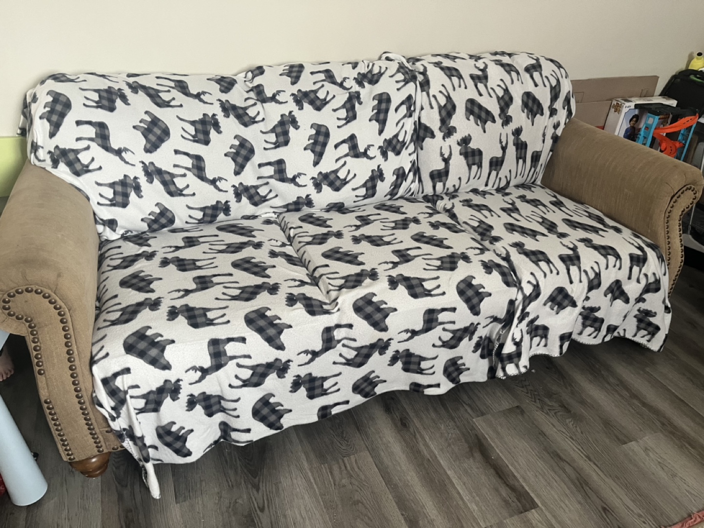 Three-seater sofa, brown fabric. Minor stains. Includes a cozy moose-patterned throw blanket As cover Good used condition. Pick up only.
